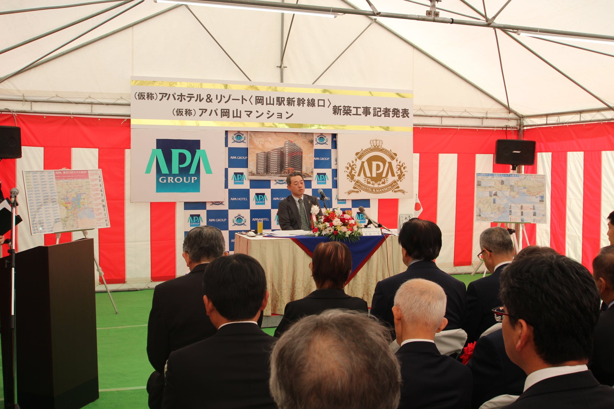 起工式において、アパグループ社長 兼 最高経営責任者(CEO)の元谷 一志は、「本日、晴天に恵まれた「晴れの国岡山」でホテル&マンションプロジェクトの起工式を開催することができ嬉しく思う。岡山は中四国の肝となる都市であり2000室程度の展開を考えている。現在、アパホテルでは岡山を含めた20の政令指定都市へ積極的に出店することで天災リスクが高い一極集中を避け、多極分散によるリスク回避を進めている。また、今回のプロジェクトではアパホテル初のホテル&賃貸マンションとして計画をしており、マンションのコミュニティとしてホテルを活用するなど新たなシナジー効果を狙っている。アパホテルではトライ&エラーを実践しており、常に進化することでネットワークを拡充し、地域と共に発展していきたい。」と述べた。