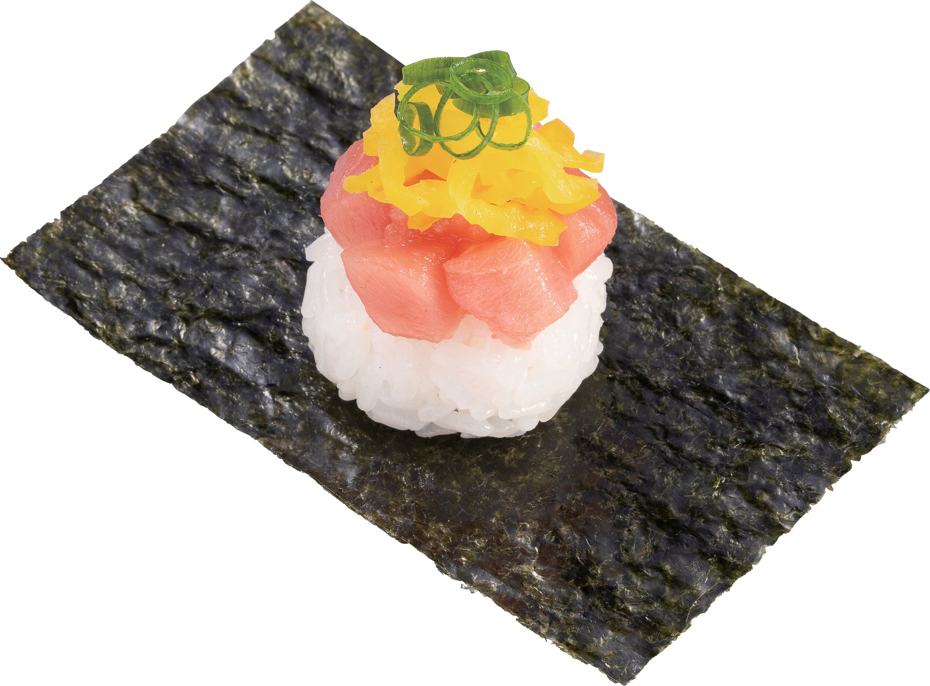 本鮪とろぶつの甘み、たくあんの食感などが楽しめる包みです。