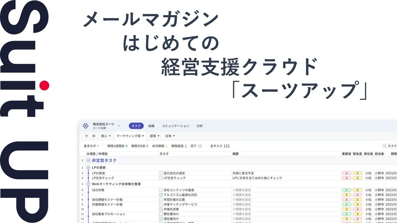 株式会社スーツ(所在地:東京都千代田区、代表取締役社長CEO:小松 裕介)は、第2弾となるメールマガジン「はじめての経営支援クラウド『スーツアップ』」を無料配信いたします。