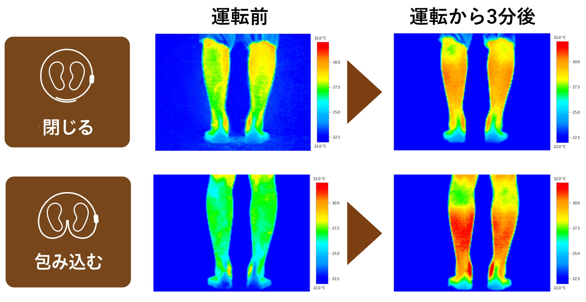 同条件下で3分間使用した場合、閉じたときはほどよく温めることができ、片足ずつ包み込んだときは、ふくらはぎや足首を中心に両足を効率的に温めることができます。このように、本体の形状を変えることで、足元を好みの温め方に調節することが可能です。