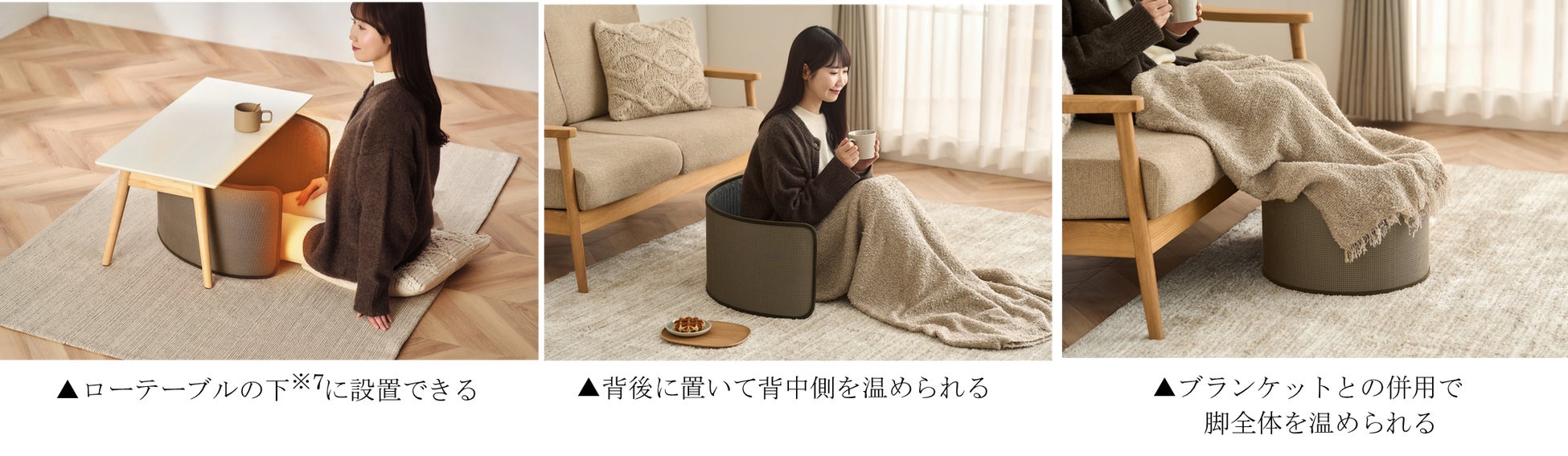 今回発売する「ぐるポカ パネルヒーター」は、1時間あたりの電気代の目安が約3.7円(※1)と、一般的なエアコン(6~14畳、約15~33円(※5))、セラミックファンヒーター(550~1200W、約17~37円(※5))と比べて、少ない電力で使用できます。形状を変更できるため、円形状だけでなくパネルを両足の間にマグネットで固定することで片足ずつ包み込めるので、ふくらはぎや足首を効率よく温められます。広げて背後に置くことで背中側も温められます。