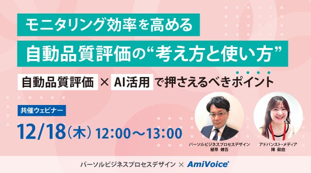 2025年12月18日(木)、株式会社アドバンスト・メディア(本社:東京都豊島区、代表取締役会長兼社長:鈴木清幸 以下、アドバンスト・メディア)は、オンラインセミナー「モニタリング効率を高める自動品質評価の“考え方と使い方”~自動品質評価×AI活用で押さえるべきポイント~」を共催いたします。
