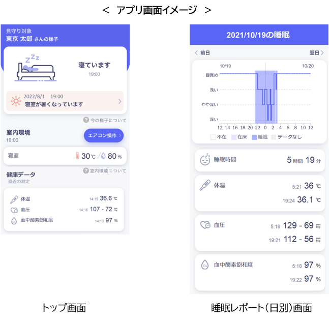 睡眠深度・時間などの睡眠の質や、入床・離床時刻の推移などの生活リズムもわかるため、離れていてもご高齢の方の生活状況を確認(*3)できます。見守られる側の方には、身に着けるセンサーやカメラが不要なため心理的、肉体的な負担をかけることなく、睡眠の深さや時間などをいつでも確認できます。