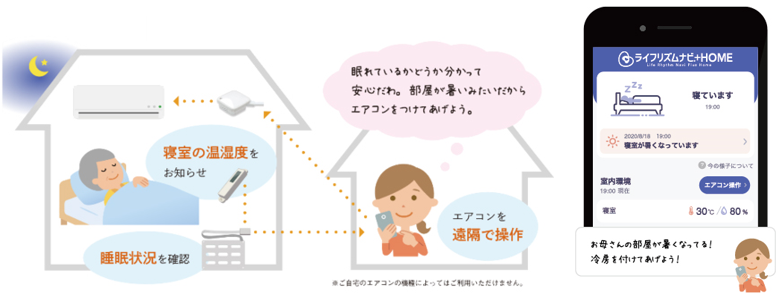 また、寝室の温度や湿度が高く(低く)なったら、専用アプリへの通知を確認し、エアコンを遠隔で操作(*4)することができるため、熱中症になりやすい季節もご家族の安心をサポートします。