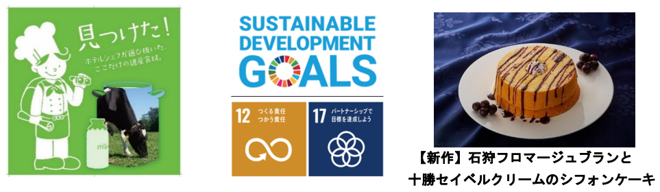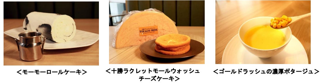 販売する商品は全4品、牛乳チーズ“石狩フロマージュブラン”と山ぶどう“セイベル”を使用した「石狩フロマージュブランと十勝セイベルクリームのシフォンケーキ」、“北大牛乳”を使用した「モーモーロールケーキ」、“十勝ラクレットモールウォッシュチーズ”を使用した「十勝ラクレットモールウォッシュチーズケーキ」、宮北農園のトウモロコシ“ゴールドラッシュ”を使用した「ゴールドラッシュの濃厚ポタージュ」です。なお、「石狩フロマージュブランと十勝セイベルクリームのシフォンケーキ」は当ホテル朝食でもまだ提供していない完全初出メニューであり、ご宿泊いただくお客様に先駆けてご賞味いただくことが可能です。