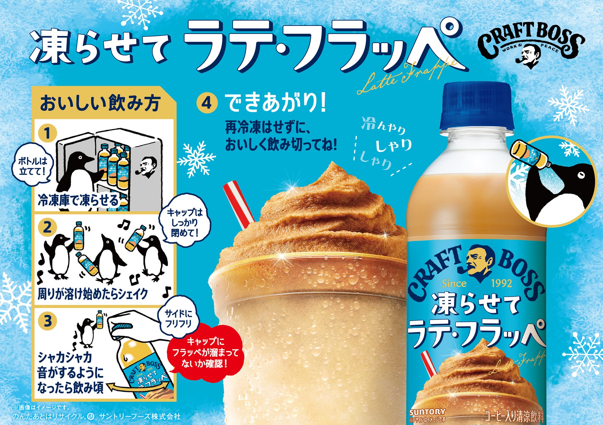 今回、「より手軽に、便利に、フラッペをお楽しみいただきたい」という想いのもと、再栓可能で持ち運びしやすく、ご家庭でも楽しめるペットボトル飲料で「クラフトボス 凍らせてラテ・フラッペ」を発売します。