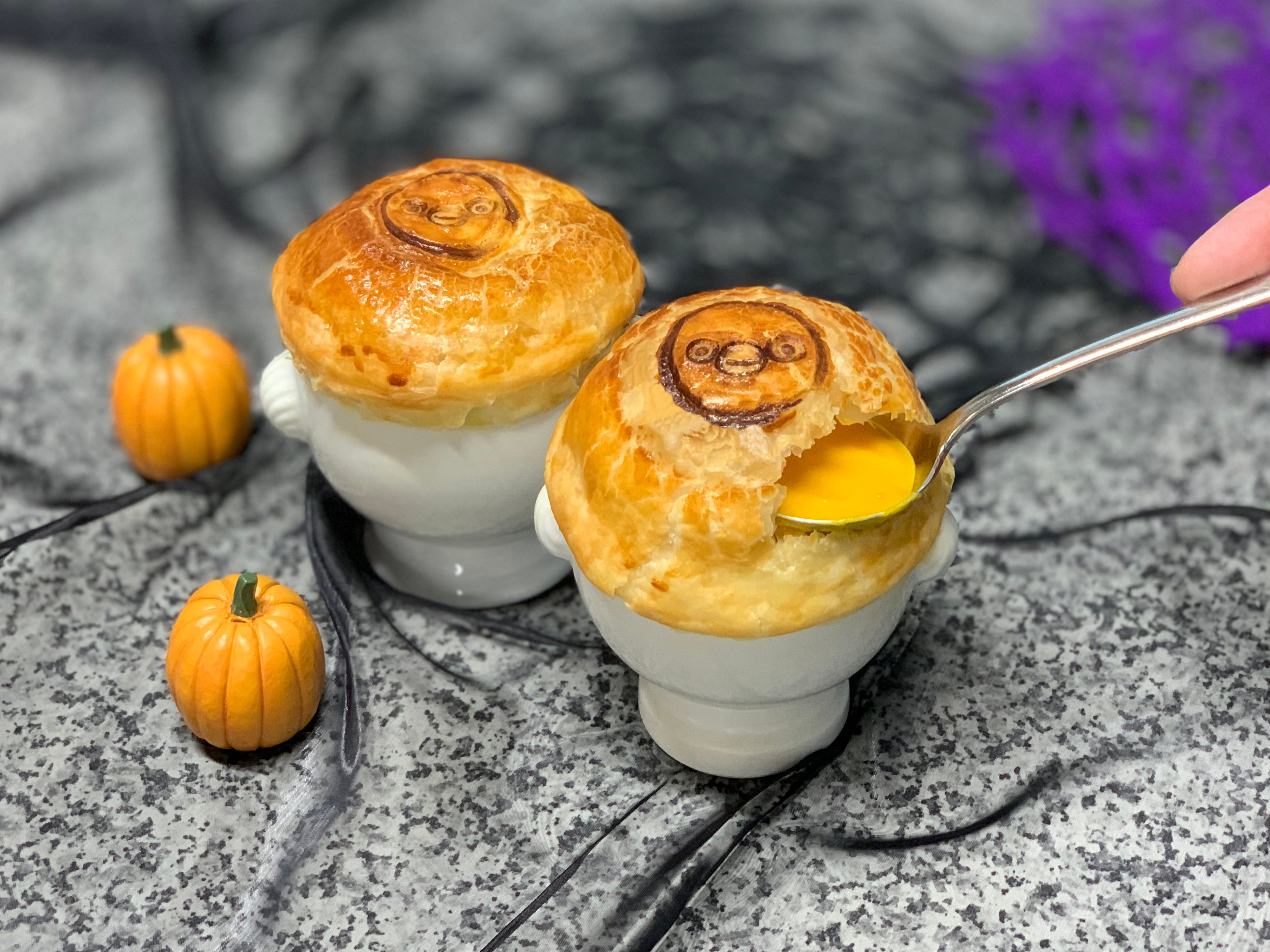 Suicaのペンギンの焼印が押されたさくさくのパイで包んだ、熱々の特製パンプキンスープ。秋を感じるコクのある味をお楽しみください。