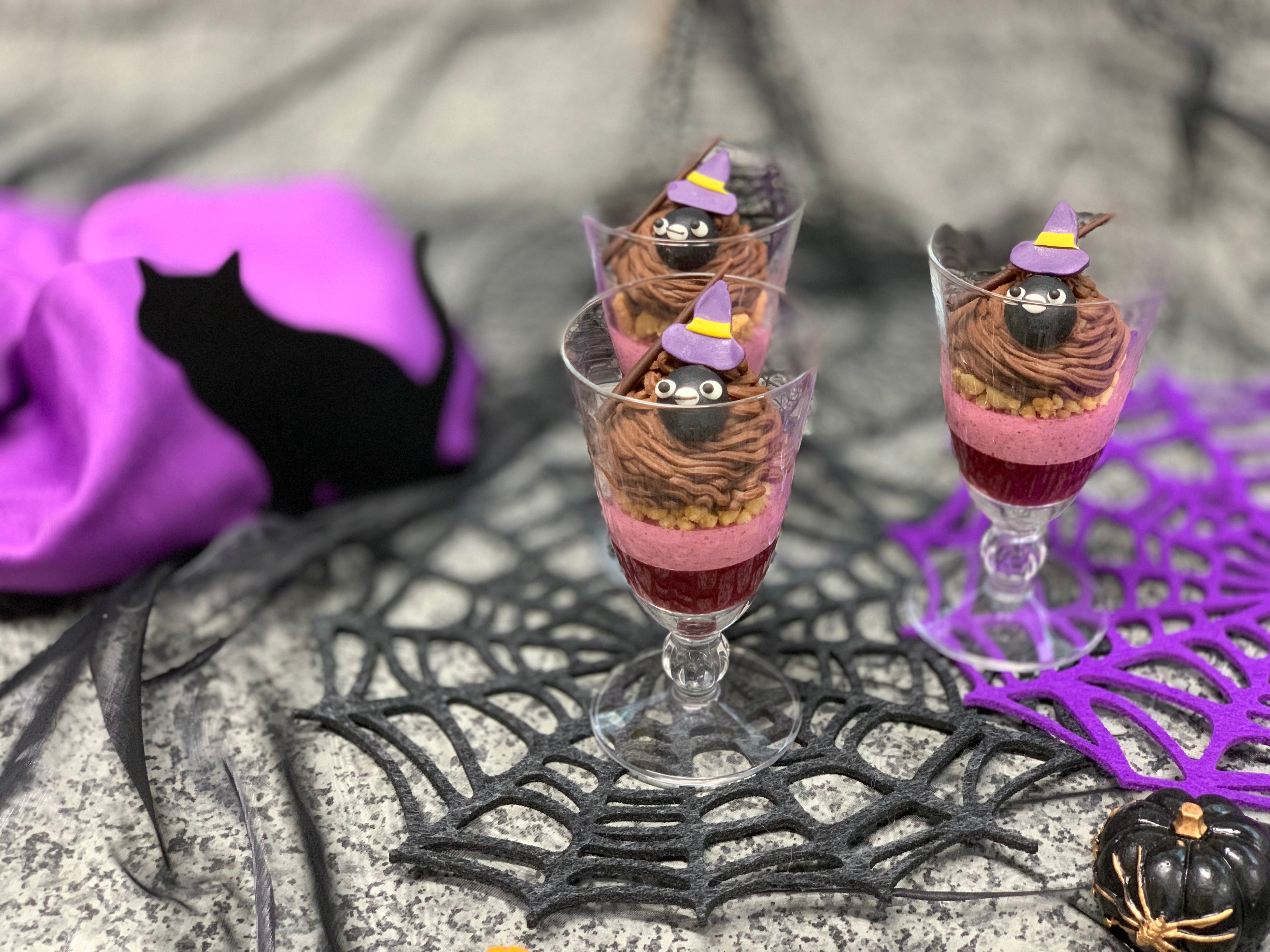 魔女の帽子をかぶる可愛いSuicaのペンギンが顔を出すミニパフェは、木苺ゼリーとカシスムース、アーモンドクランブルの上に上品なマロンクリームで仕上げた一品です。