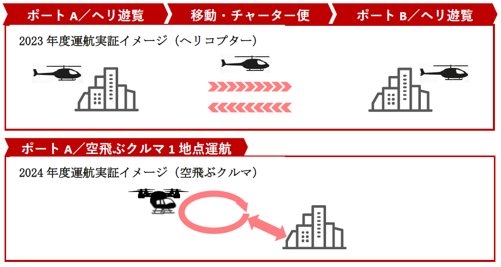 本プロジェクトでは、2022年度に都心の主要な拠点を結ぶ移動サービス(都市内アクセス)、空港からの二次交通(空港アクセス)、離島地域における移動サービスや遊覧飛行など、都内での様々な空飛ぶクルマ※2のビジネスモデルを検討し、2023年度にヘリコプターによる運航実証、2024年度に空飛ぶクルマによる運航実証、離着陸場オペレーションの検証を通じて、運用の課題や収益性などを検証します。
