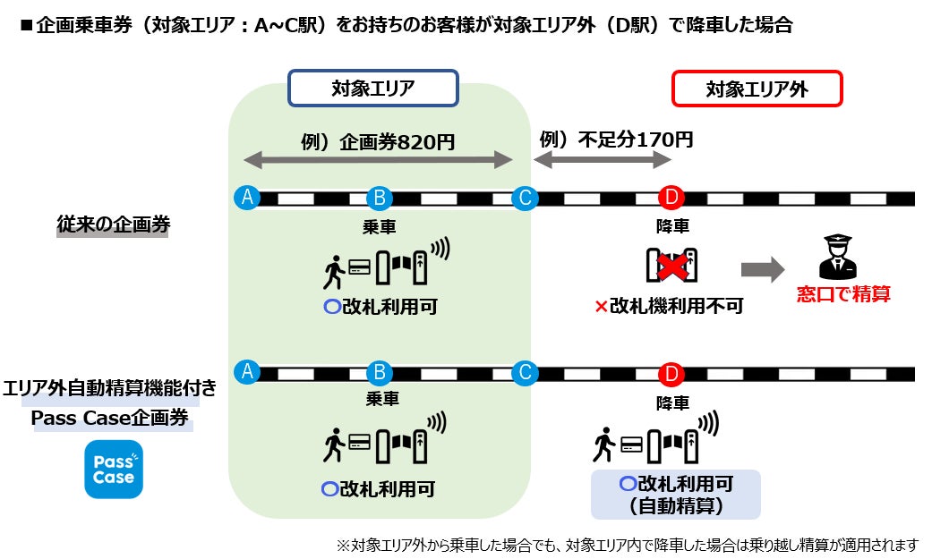 「Pass Case」では、現在、交通事業者が提供する"特別な運送条件(エリア、列車、経路など)を定め便利にお得に移動できる企画乗車券"を取り扱っております。従来の"対象エリアを限定した乗り放題などの企画券"では、対象エリアと対象エリア外をまたぐ乗降の場合、窓口等で不足する運賃を精算する必要がありました。今回追加するエリア外自動精算機能は、不足運賃分を自動精算する機能であり、窓口等での精算が不要となります。これにより、「Pass Case」で企画券を購入されたお客さまは、対象エリア内から乗車し、対象エリア外で降車いただく場合でも、企画券を購入したクレジットカード等を改札の専用端末にかざすだけで、乗降することが可能となります。