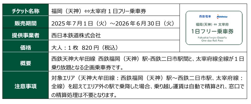 「Pass Case」のエリア外自動精算機能を付与した企画乗車券の第一弾として、2025年7月1日(火)より、西日本鉄道株式会社が販売する『福岡(天神)⇔太宰府1日フリー乗車券』の取り扱いを開始します。