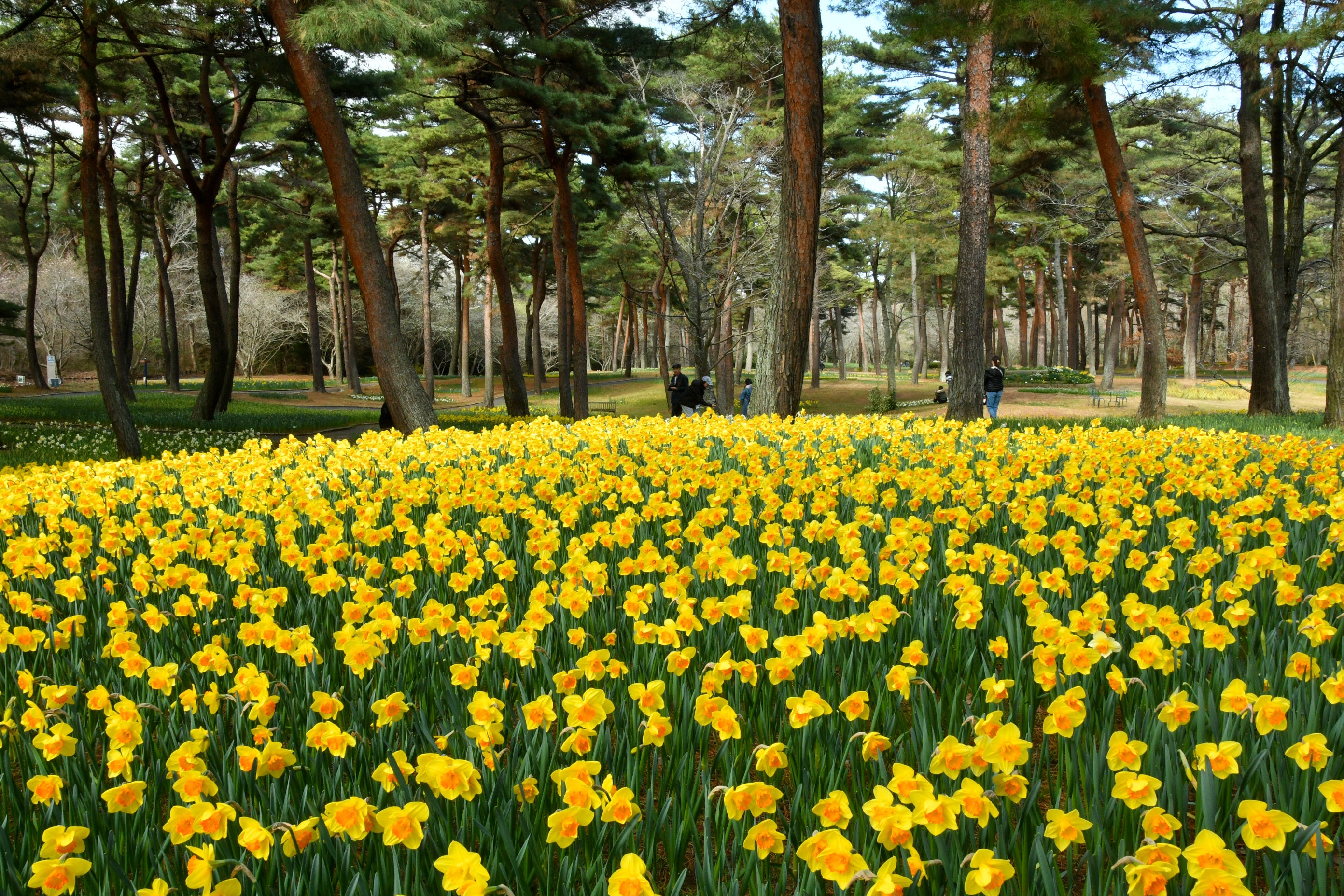 国営ひたち海浜公園の「スイセンガーデン」では、約100品種・約100万本のスイセンが3月18日(水)から咲き始め、現在は3分咲きとなっています。今年のスイセンの見頃時期は平年並みで、4月4日頃に見頃を迎え、その後18日頃まで続く見込みです。木漏れ日が差し込む林床では、黄・白のスイセンが絨毯のように広がる幻想的な風景をご覧いただけます。