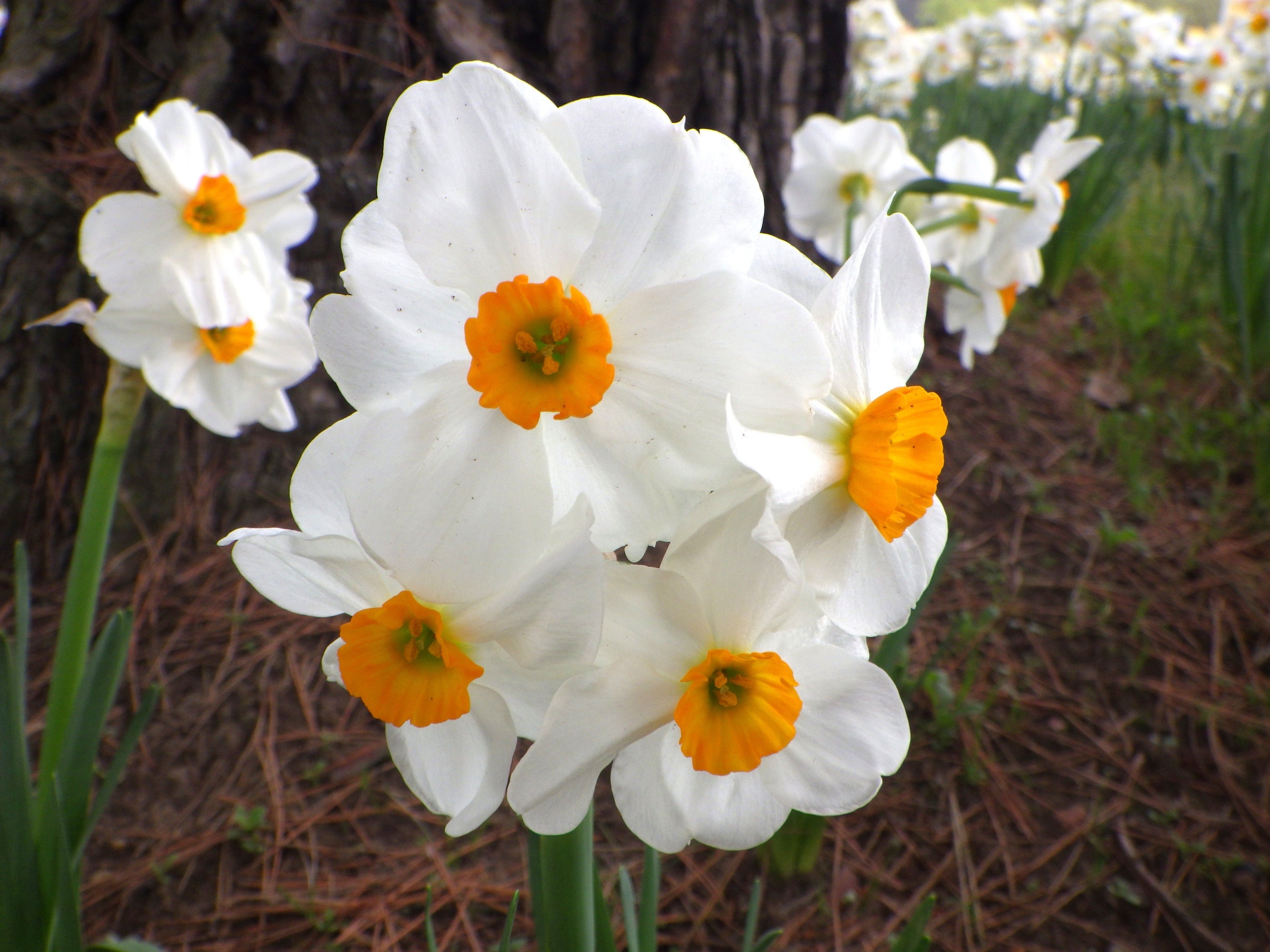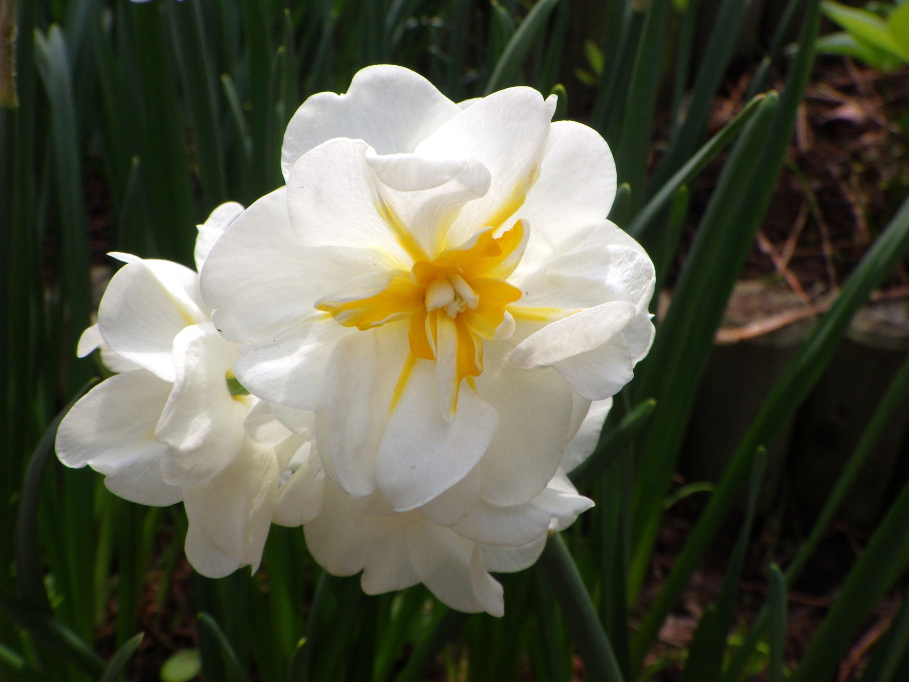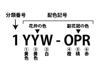 スイセンの園芸品種には、英国王立園芸協会(RHS)による分類記号があり、花の特徴に応じて13種類に分類されています。例えば「ゼラニューム(8W-O)」は、花弁が白色で副花冠が橙色の房咲きスイセンです。
