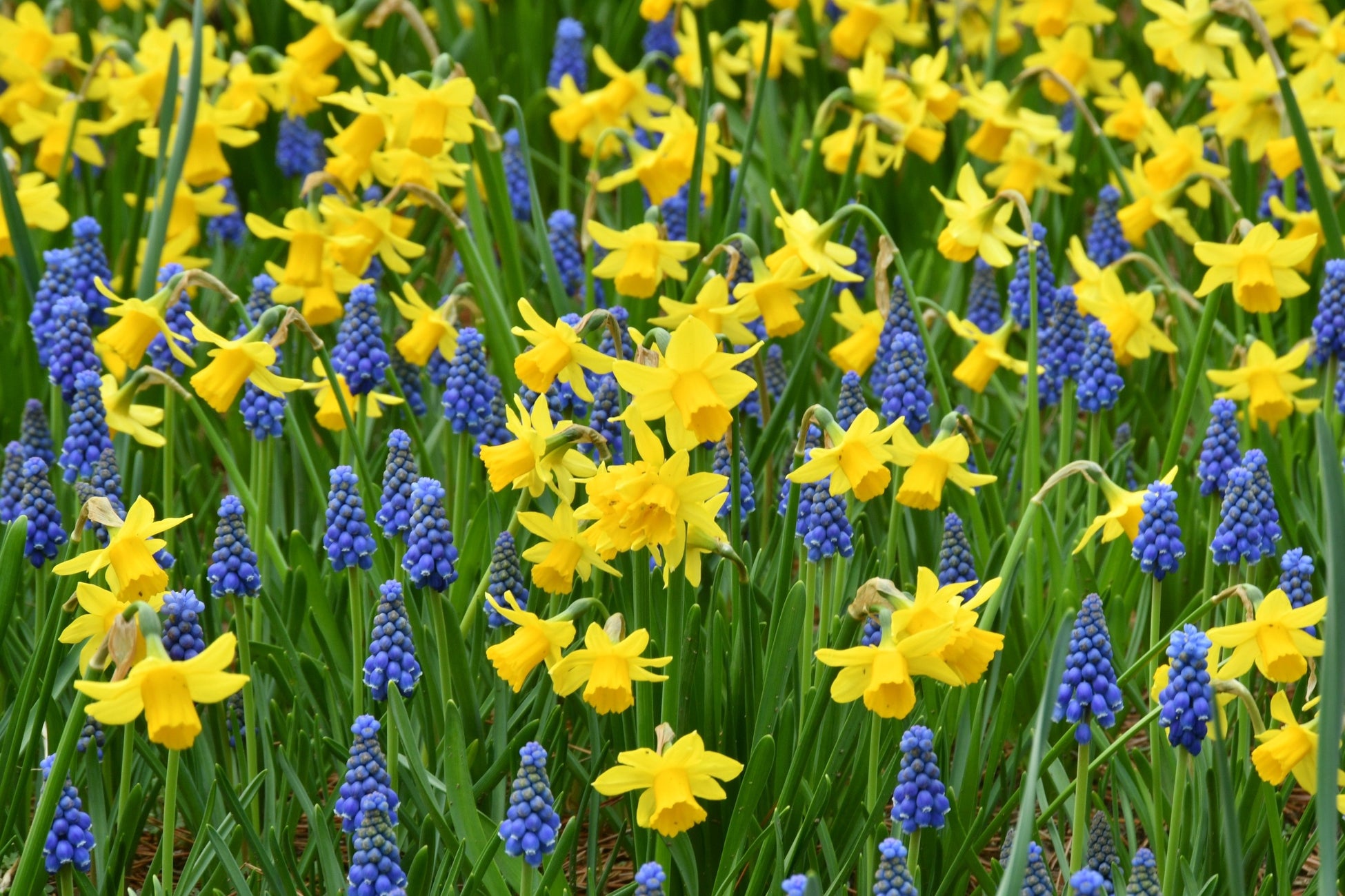 ミニスイセンとムスカリのコラボレーションエリアが新たに登場しました。ほかのスイセンに比べて背丈の低いミニスイセンと、鮮やかな青色のムスカリが織りなす可憐な花景色をお楽しみいただけます。
