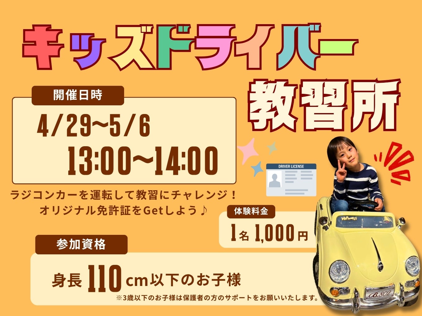 ラジコンカーを使って運転体験ができる体験型コンテンツ。館内の教習コースにチャレンジ!参加者にはオリジナル免許証をプレゼントいたします。
