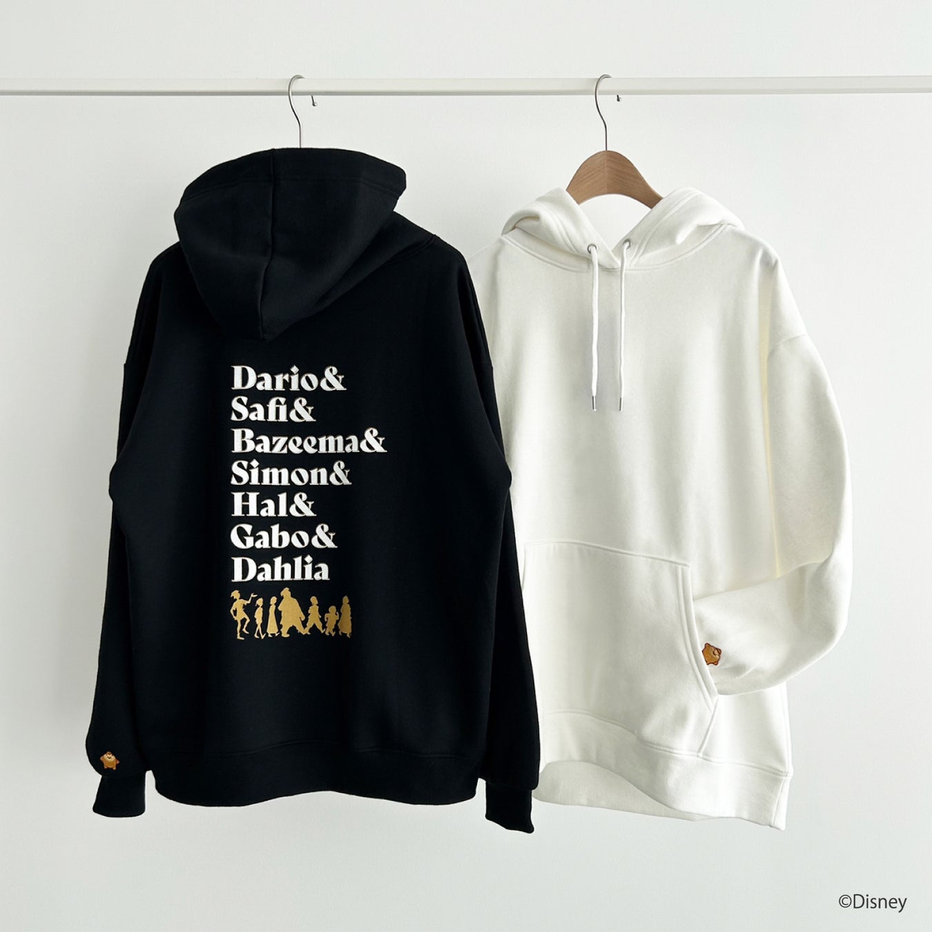 バックに「アーシャ」の友人たちのなまえとシルエットがプリントされたゆったりシルエットのパーカー。左袖のリブ部分には「スター」の刺繍がワンポイントに。