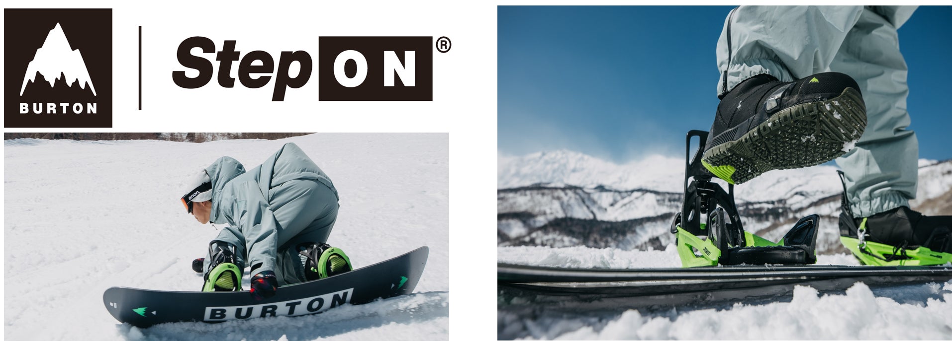 レンタルスノーボードはBURTON製品に統一されており、大人用サイズはStep ON®を導入しています。Step ON®はブーツを固定する際のストラップの機構が無く、ブーツ前部に 2 つ後部に 1 つ取り付けられた金具をビンディングにはめ込むことにより固定するシステムです。立ったまま簡単に板を着脱できるので手やお尻が濡れない事や、装着の時間が短縮され滑走時間が長く確保できるメリットがあります。たんばらスキーパークでは、アップグレード料金なしで、通常のレンタル料金でStep ON®の機材でスノーボードをお楽しみいただけます。