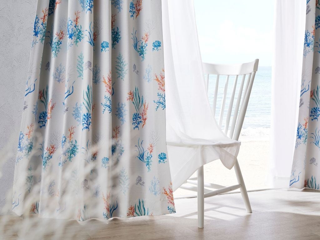 外気を遮ってくれるコーラルリーフ柄のカーテンで、食事の時間を涼しく過ごしやすく。