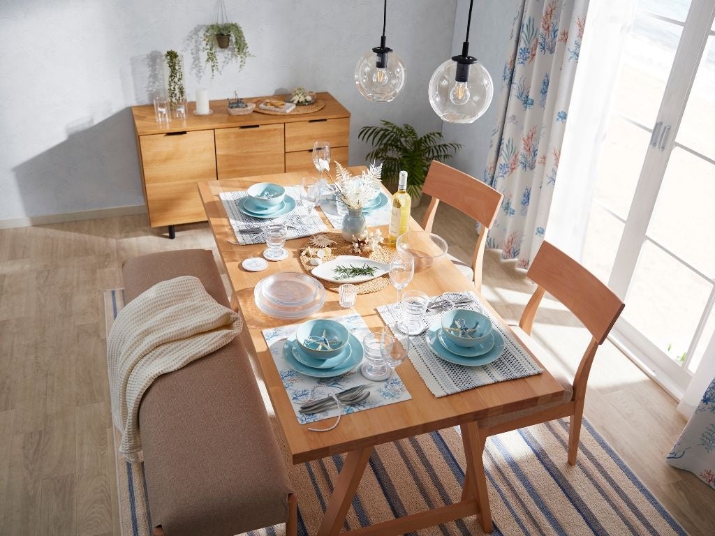 食卓に彩りを添えるランチョンマットは、汚れをサッと水拭きできるPVC素材を使用しています。