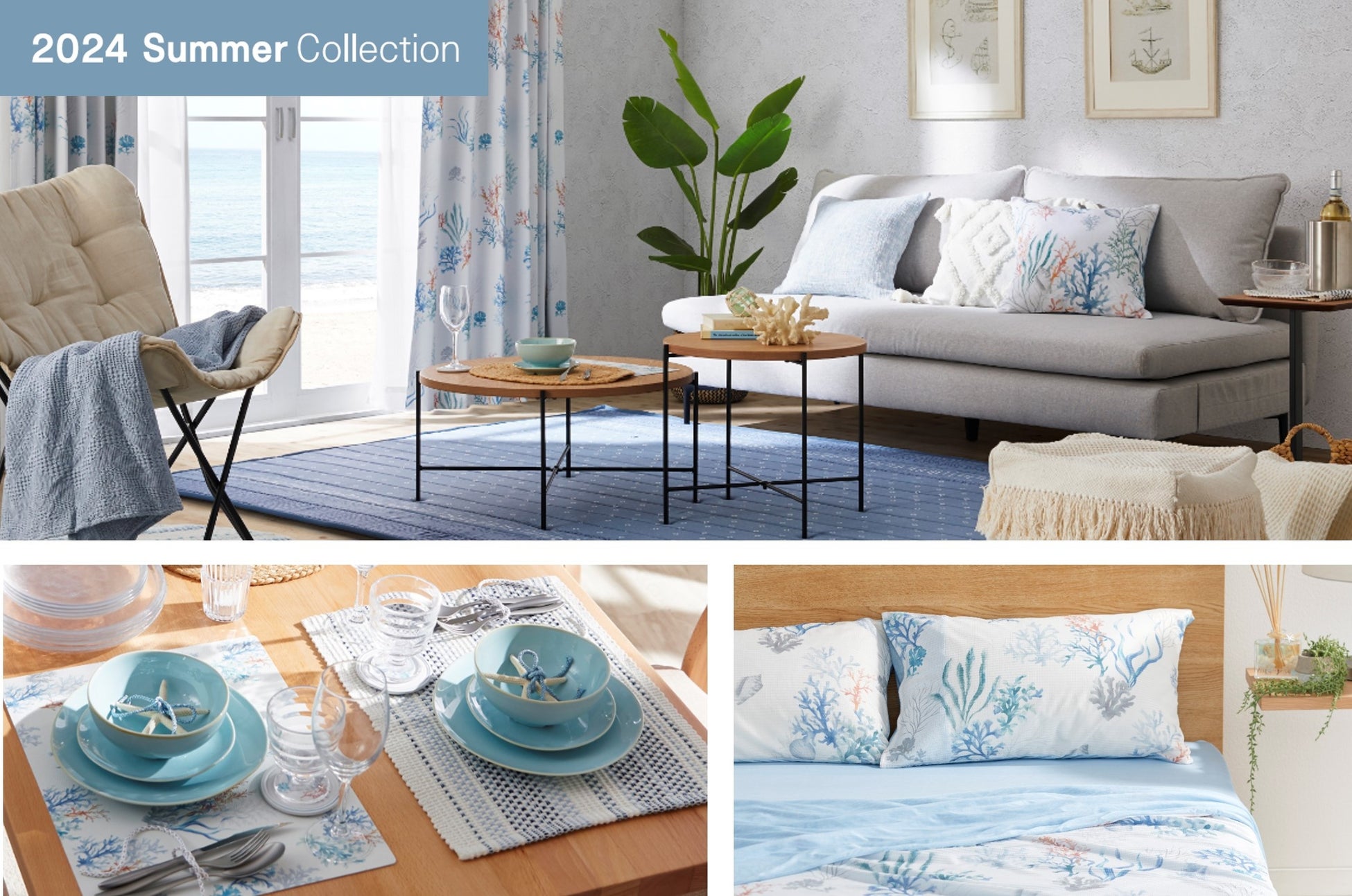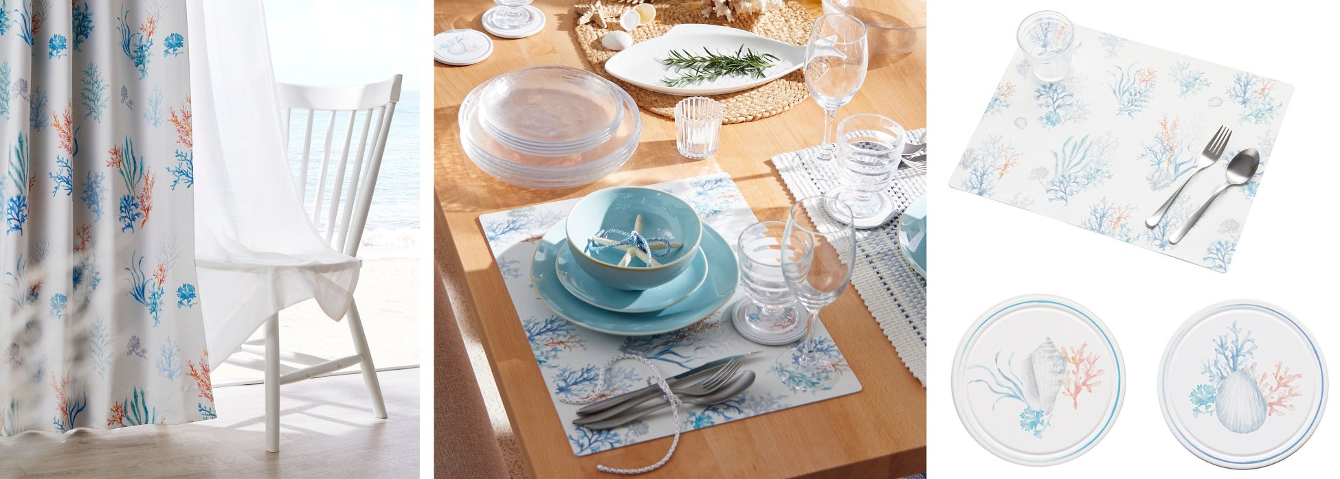 コーラルリーフをメインモチーフに、海をイメージした色と柄でそろえれば、一気に夏らしく、ビーチリゾートで過ごすようなリラックス感を味わえます。