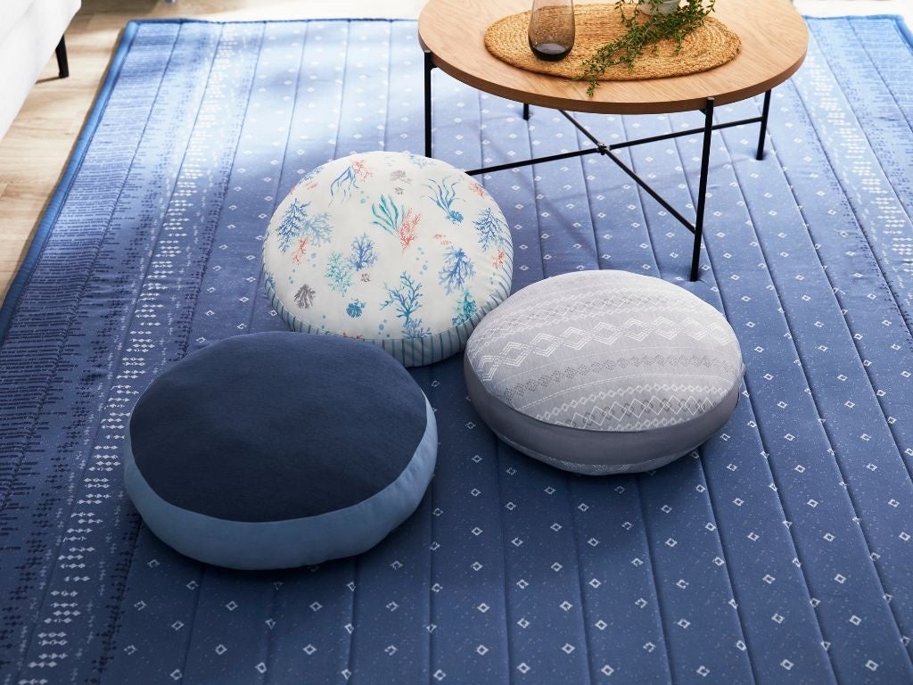 床にもNクールのラグやクッションを用意すれば、足を伸ばして座ったり、ごろんと寝転がりたくなるリラックススペースに。