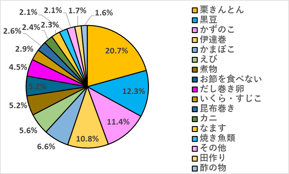 おせちの中で1番好きな料理については、「栗きんとん」が20.7%、「黒豆」が12.3%、「かずのこ」が11.4%という順になりました。甘い栗や豆を使った料理が人気のようです。