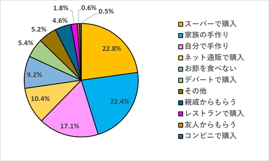 おせちの入手方法については、「スーパーで購入」が22.8%、次いで「家族の手作り」が22.4%、「自分で手作り」が17.1%という順になりました。年末になると、おせちがスーパーにたくさん売られていたり、手作りする人もいたりするそうです。