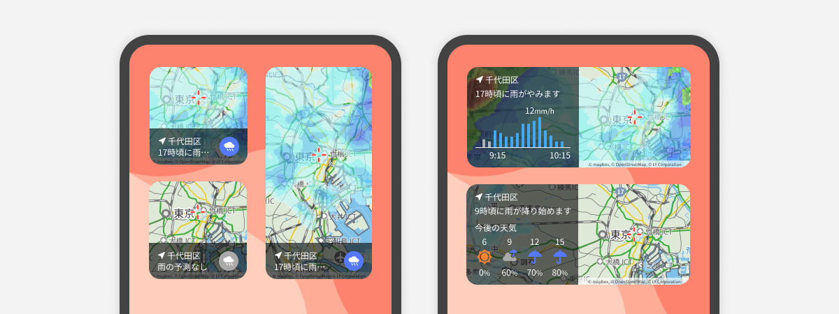 新ウィジェットは、以前から提供していた「天気予報」「雨雲レーダー」「気温グラフ」をリニューアルし、より見やすく情報を整理し直したほか、新たに気温、湿度、風速、降水量、気圧、日照のうち、ユーザーが見たい情報を拡大表示できる「現在の天気」を加えました。これにより、「Yahoo!天気」アプリ内で提供している「雨雲レーダー」における「まもなく雨が降りはじめます」などのメッセージや、時間ごとの降水量グラフなど、利便性の高い機能もウィジェットを通してホーム画面で確認できるようになりました。