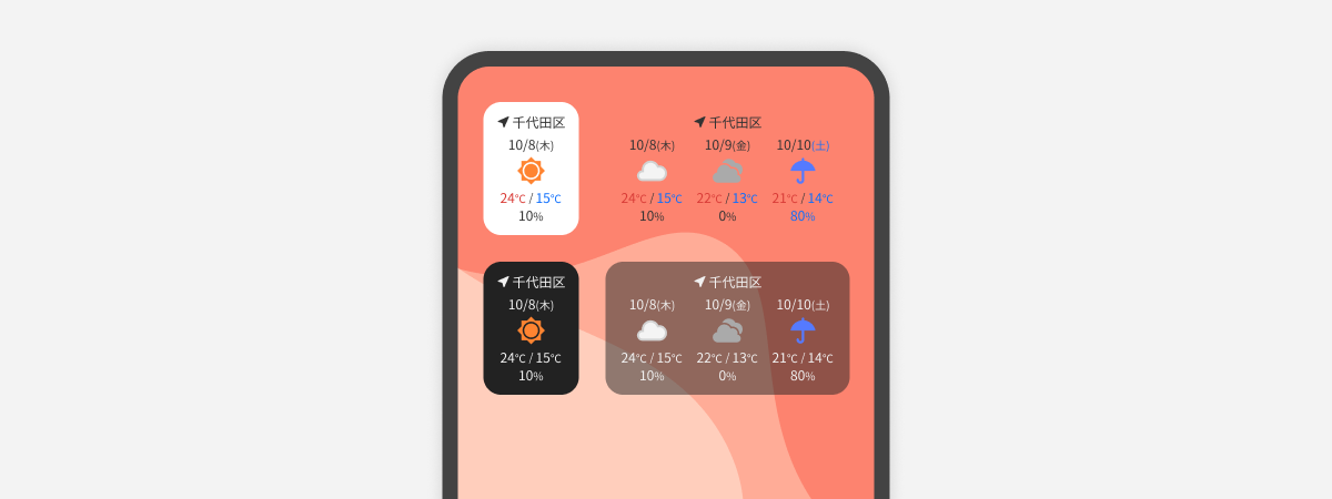 1日ごとの天気予報を表示します。設置サイズに応じて、最小1日から、スマートフォンの場合は4日前後、タブレットなどの大型端末の場合は最大で9日分まで表示できます。