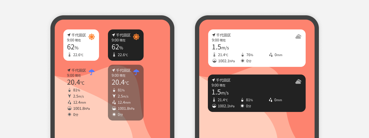 現在の気温、湿度、風速、降水量、気圧、日照のうち、ユーザーが設定した情報を1つ拡大して表示できます。またサブ要素として、メインで選んだ1つ以外の情報を1つから5つ表示することができます。