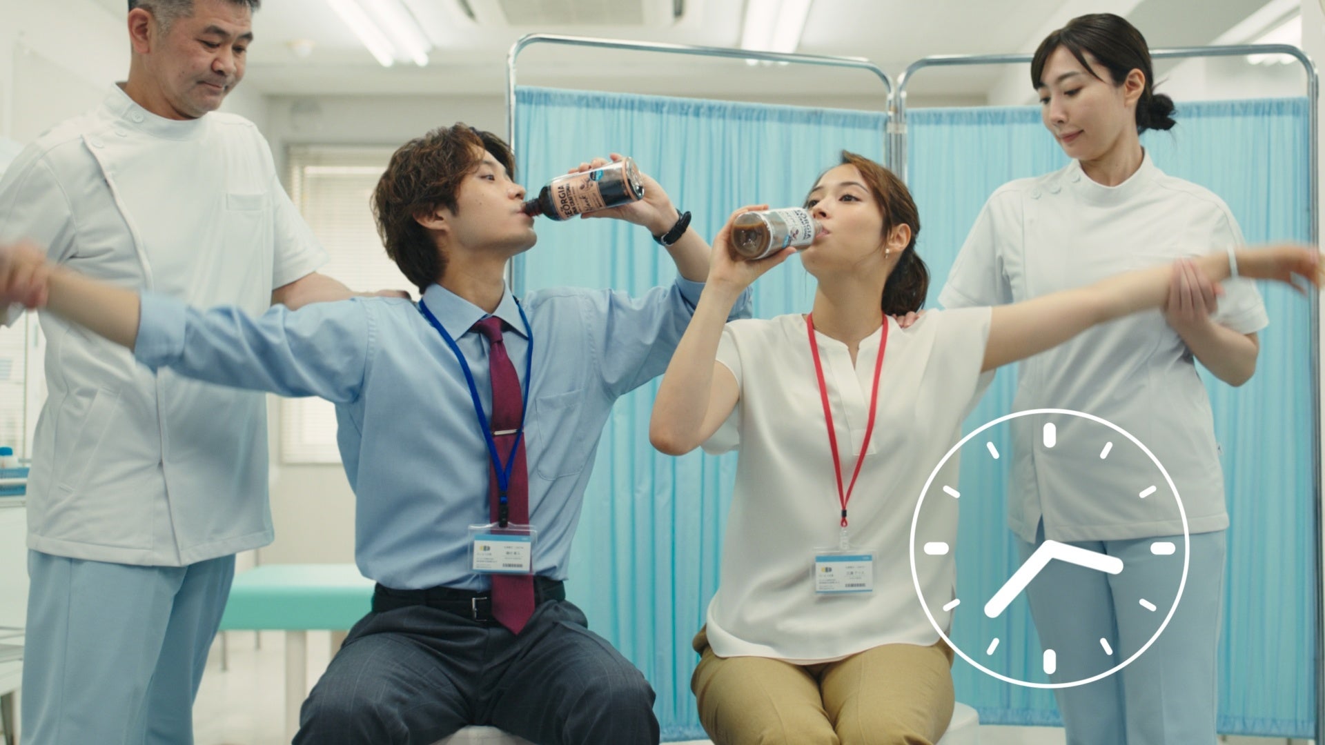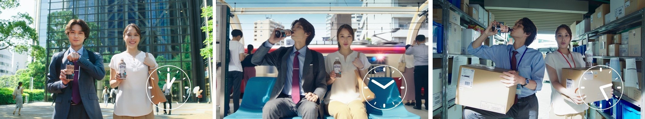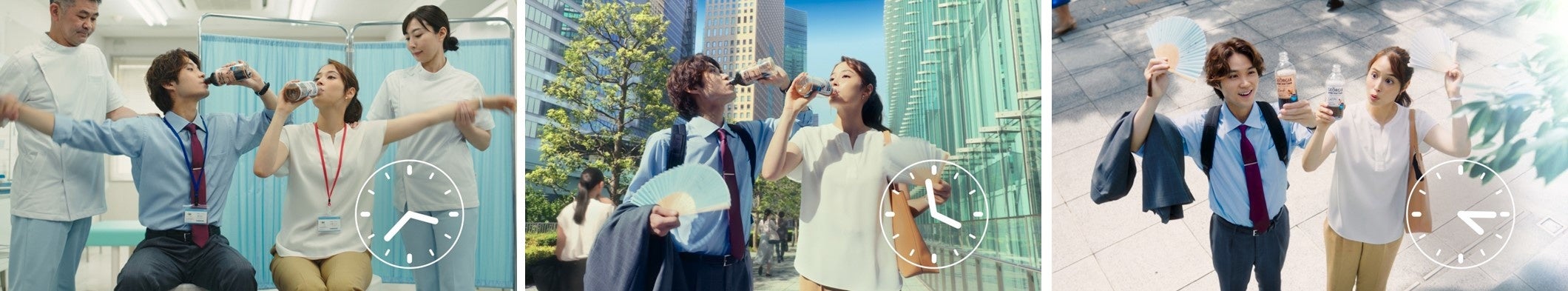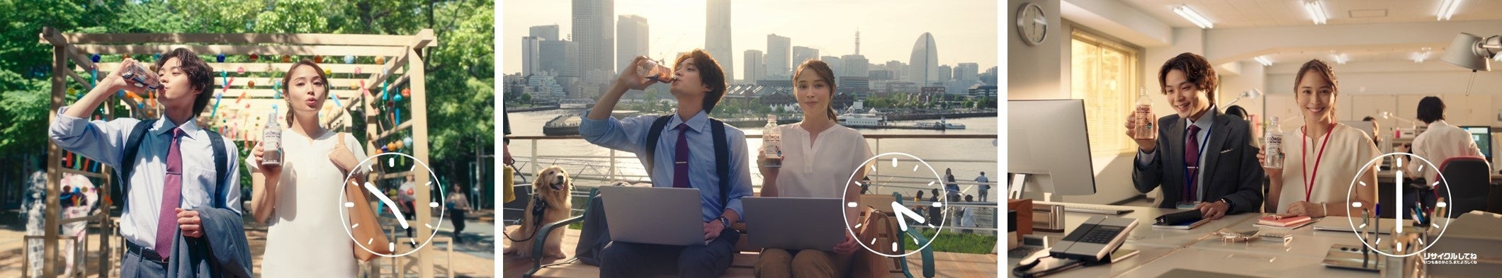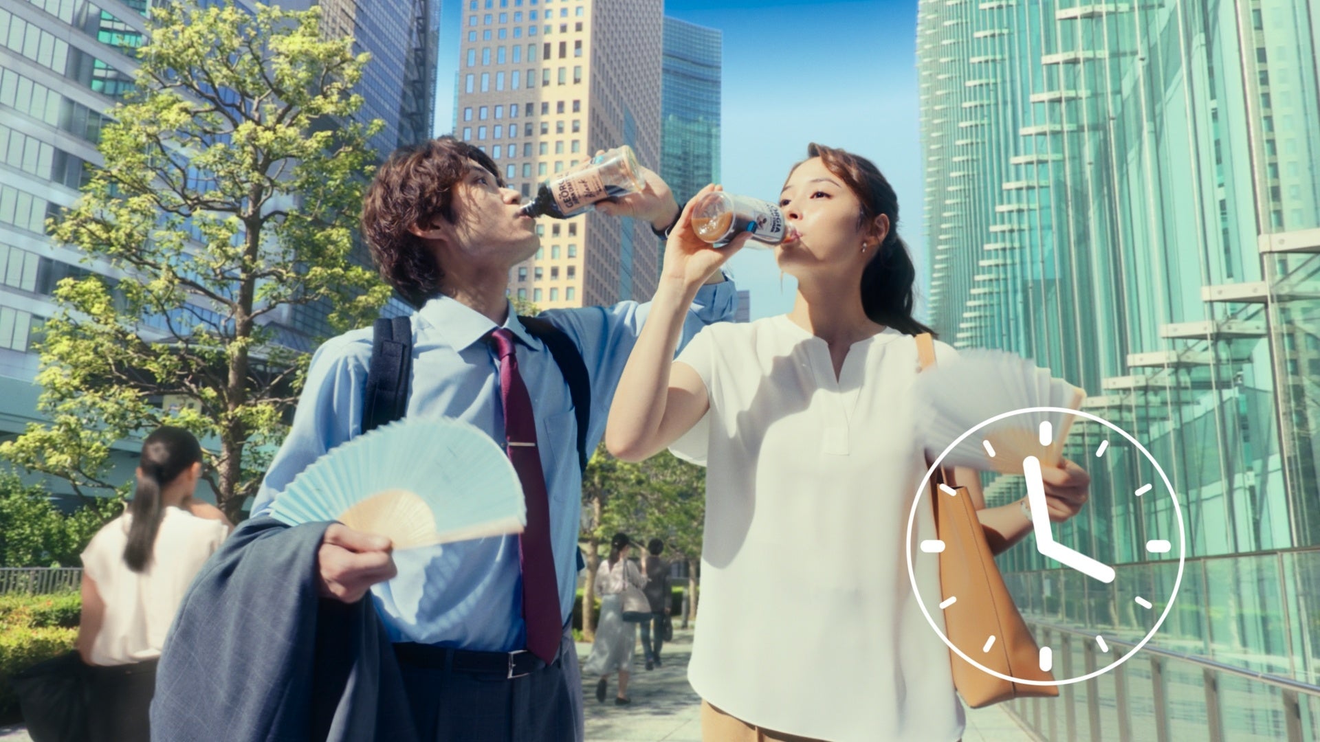 外回りを終え一旦会社に戻った2人は、医務室で疲れた体をほぐす施術を受けながら、また一口。再び外出した2人は青空のビル街で一口。日差しが照り付ける中、扇子で日差しを遮りつつ、次のシーンでは涼しげな風鈴の前で休憩しながら一緒に一口。夕方には公園のベンチでPC作業をしながらまた一口飲み、そんな2人を散歩中の犬が覗くシーンも。