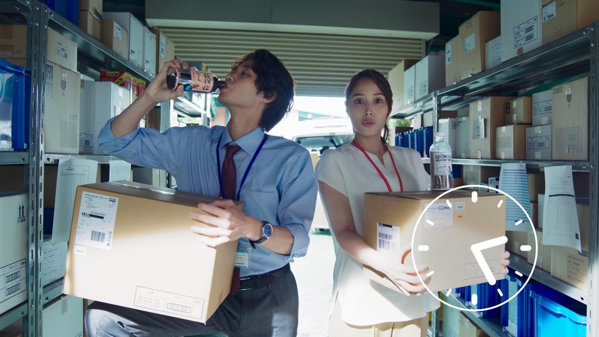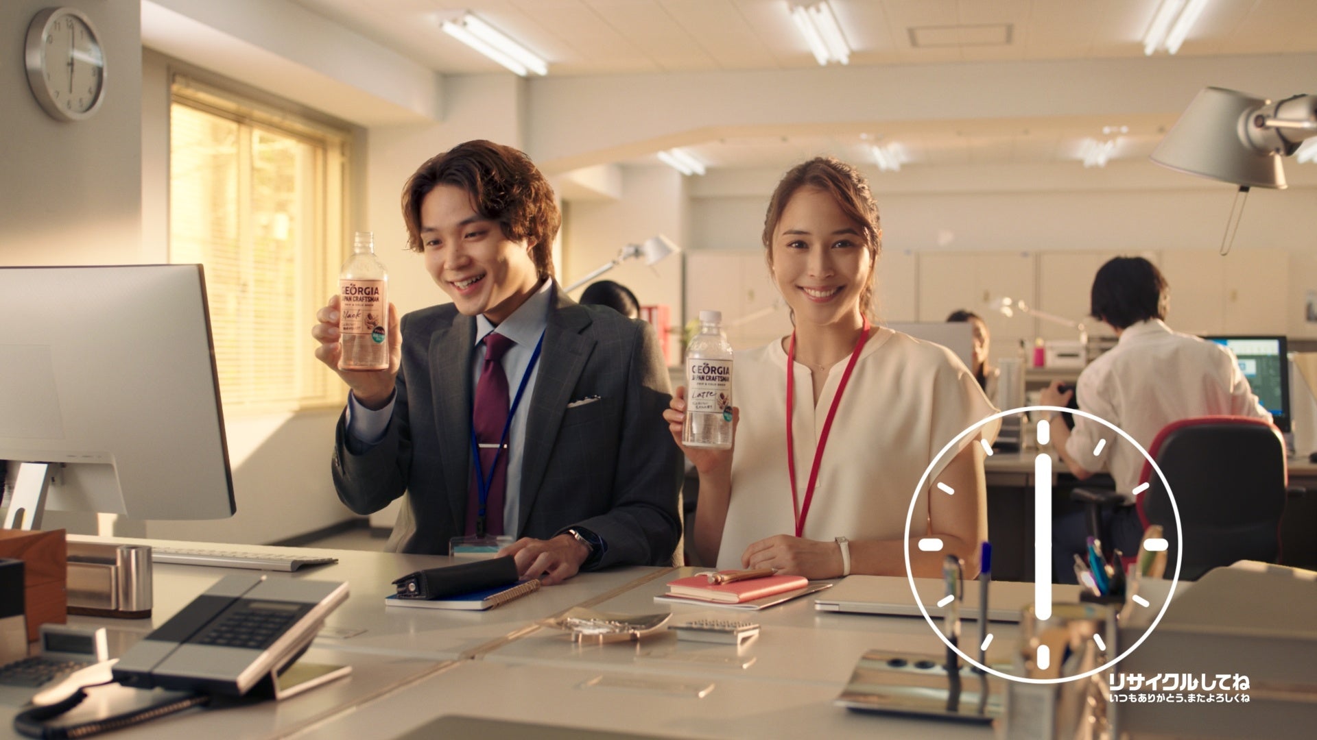 外回りを終えた2人はようやくオフィスでひと息つき、気づけば残りわずかになった「ジョージア ジャパン クラフトマン」を飲む広瀬さん。磯村さんは最後の一口を飲み切り、「うんま!」と一言。ナレーションでは広瀬さんの「このPETのジョージアは、ずーーーっとおいしさつづく」とコメントが入ります。