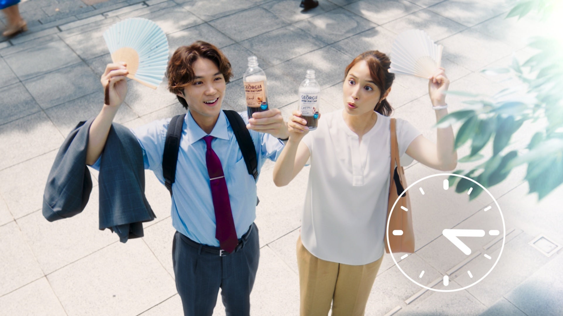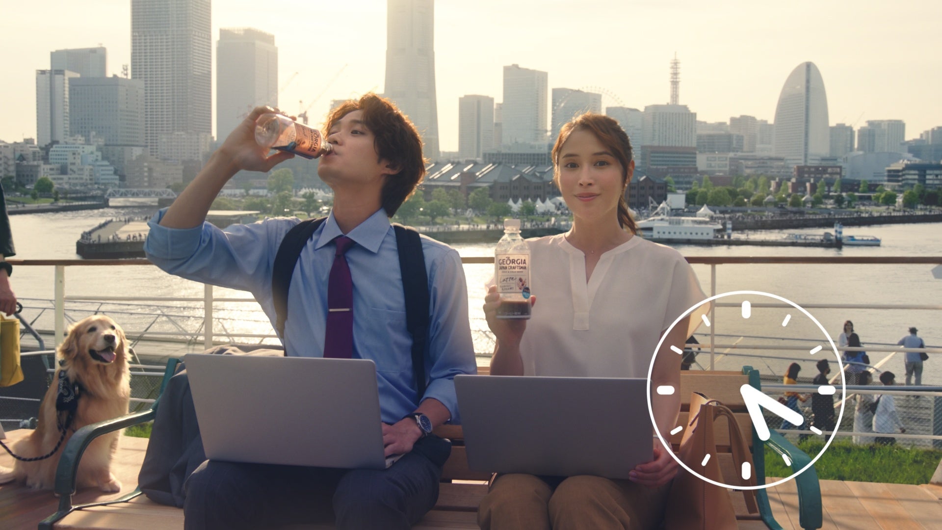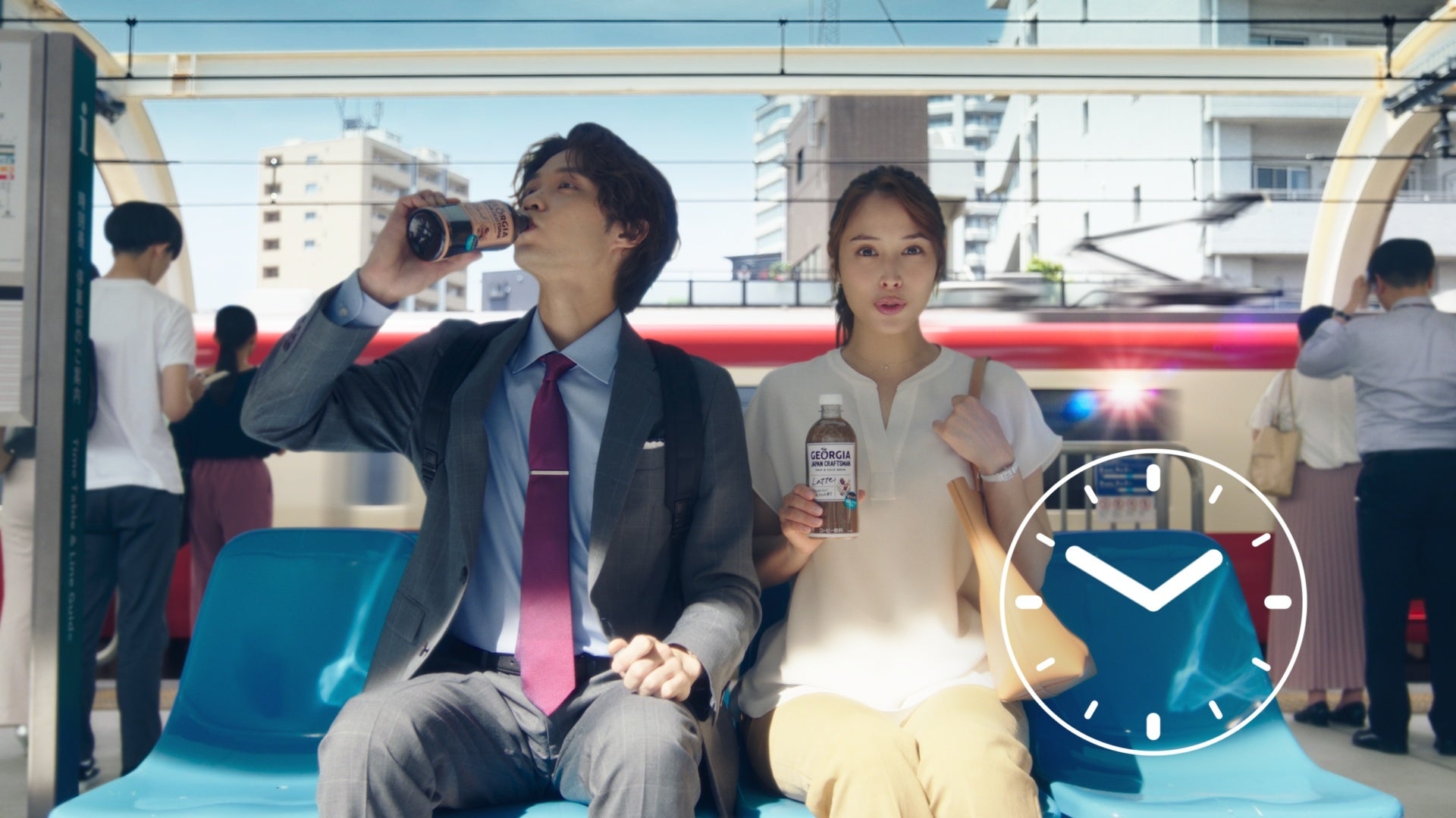 シーンの冒頭では、オフィス前で「ジョージア ジャパン クラフトマン カフェラテ」を手にする広瀬さん、「ジョージア ジャパン クラフトマン ブラック」を手にする磯村さんからスタート。駅のホームや外出先、ビル街など、会社員として働くさまざまなシーンで「ジョージア ジャパン クラフトマン」を飲む2人の様子が描かれます。