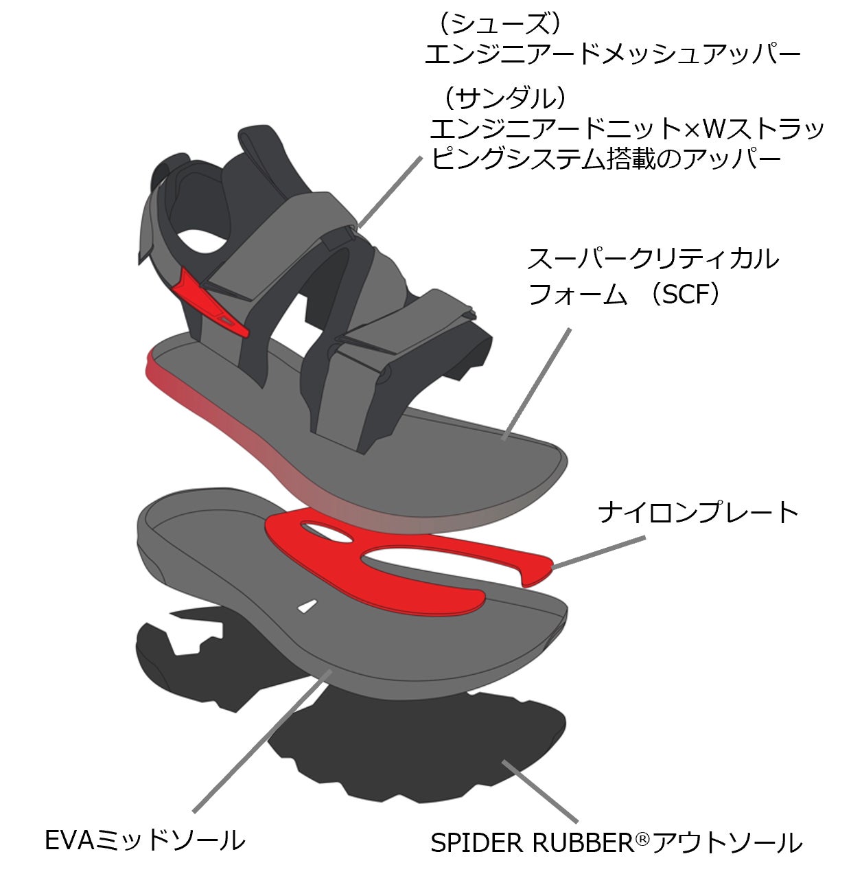 エンジニアドメッシュアッパーを採用。優れた通気性と前足部の安 定性を両立し、多様な千栄で快適なランをサポート HYPER-COMF Technologyを使用したソール (サンダル&シューズ共通) 硬度の違うミッドソールを使用。究極のクッション性を発揮する スーパークリティカルフォームと安定性を補うEVAミッドソール。 内蔵されたナイロンプレートは推進力を安定させ、ねじれを補正。 グリップ力の効いたTevaオリジナルのSPIDER RUBBER®️アウト ソールを採用。