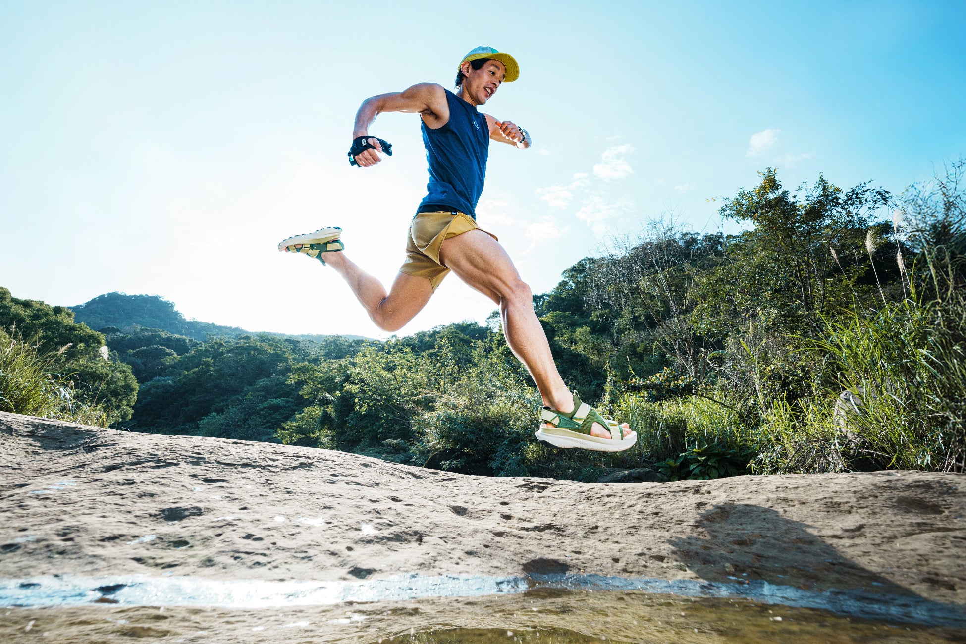 「Aventrailサンダルのアッパーデザインはパフォーマンスと健康のための重要な通気性を備えており、足をしっ かりと固定できます。一方で、オープントゥなのでつま先に自由度があり、自然とのつながりを足元から感じるこ とができ、よりアウトドアを楽しむことができます。高度なパフォーマンスを発揮するトレイルランニングサンダ ルとトレイルランニングシューズの違いは、自由な動きの感覚が飛躍的に向上することです。このサンダルは、ラ ンニングシューズのグリップ力、クッション性、推進力の特性を備えており、さらに高性能な要素が追加されています。