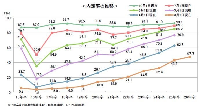 ○内定率は47.7%。前年同期実績(43.2%)を4.5ポイント上回る