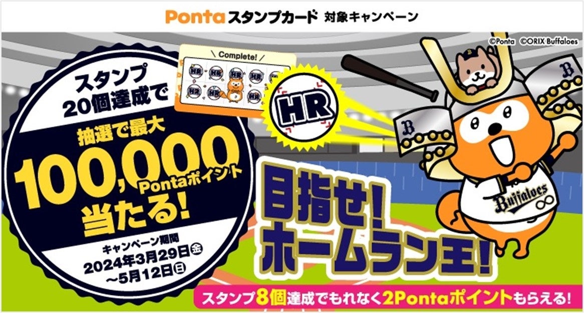 2024年3月29日(金)~5月12日(日)、「バファローズ☆ポンタキャンペーン 目指せ!ホームラン王!」を開催します。Pontaスタンプカードでエントリーの上、対象提携社で3Pontaポイント以上ためると、1日1個のスタンプを獲得できます。コンビニや飲食店、ドラッグストアなど40ブランド以上が対象となります。スタンプを8個以上獲得した方にもれなく2Pontaポイントをプレゼントします。スタンプを10個以上獲得すると抽選に参加でき、抽選で合計201名様に最大10万Pontaポイントをプレゼントします。