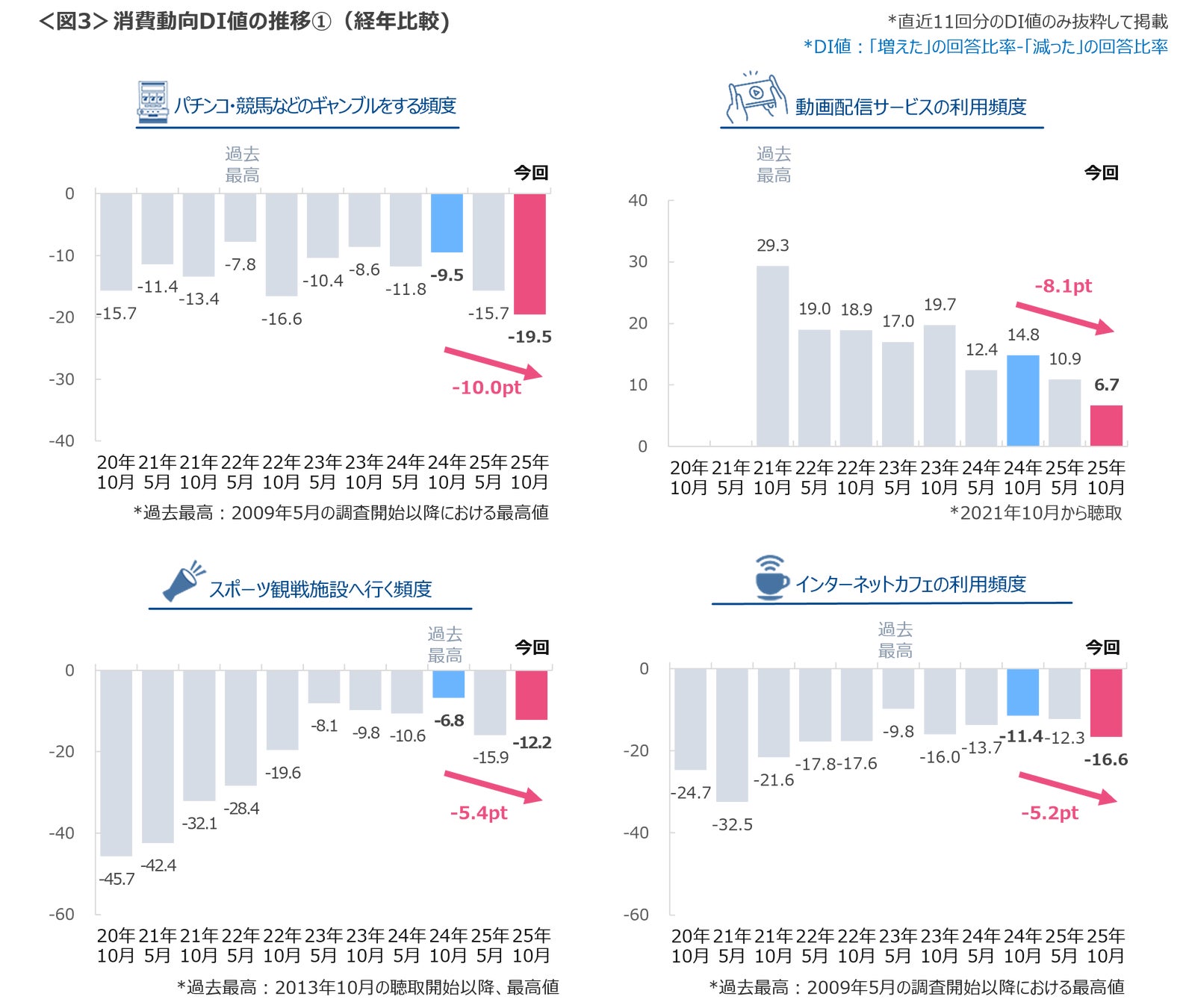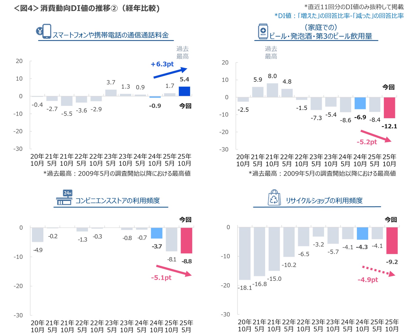 消費動向については、「パチンコ・競馬などギャンブルをする頻度」「動画配信サービスの利用頻度」「スポーツ観戦施設へ行く頻度」「インターネットカフェの利用頻度」といった娯楽や趣味関連の項目が5~10pの低下。「家庭でのビール類の飲用量」「コンビニエンスストアの利用頻度」「リサイクルショップの利用頻度」が5ptの低下。一方「スマートフォンや携帯電話の通信通話料金」は6pt上昇した。本調査で聴取しているその他の消費動向の項目をみると、ややプラスとなったのは「保険料」「クレジットカードの利用金額」のみで、多くは前年同期に比べマイナスや横ばいの傾向。止まらない物価高から依然として消費を抑えようとしている様子がうかがえる。<図3、4>