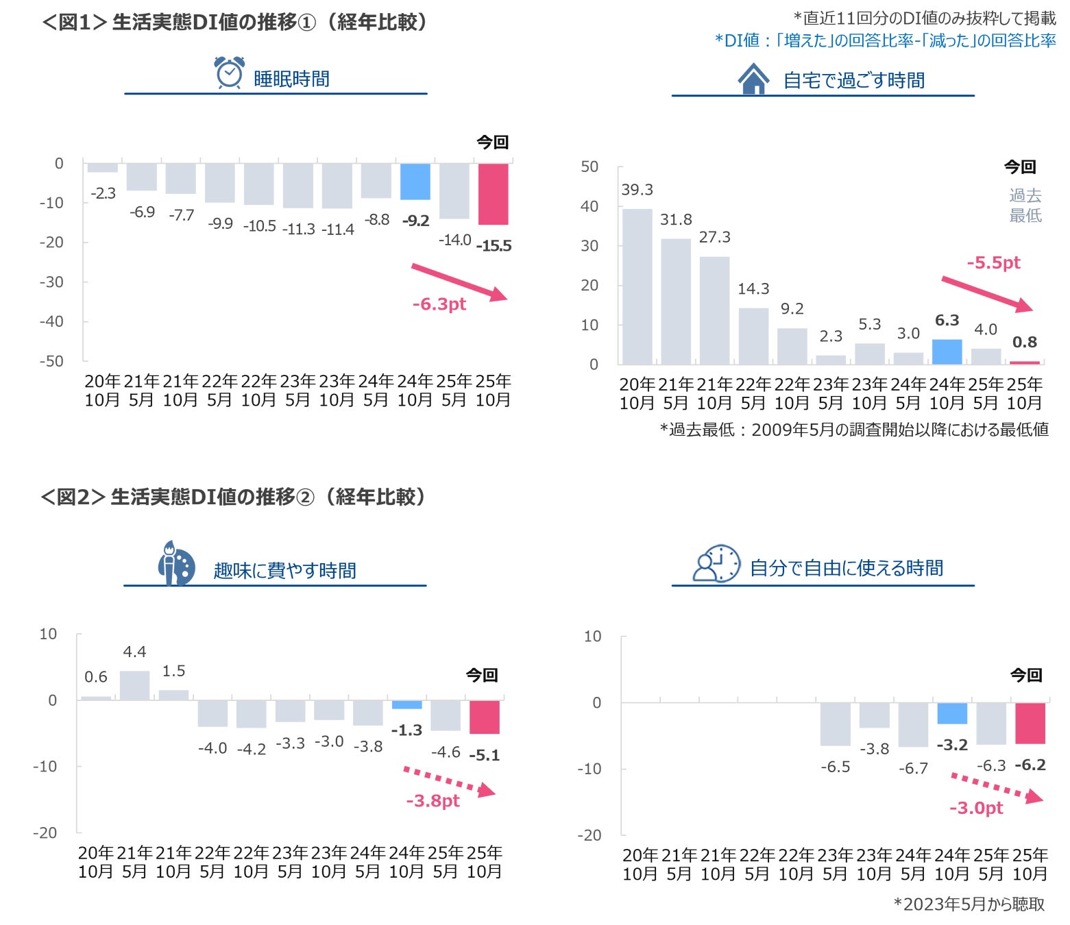 生活実態DI値「睡眠時間」と「自宅で過ごす時間」は、前年同期より6ptの低下であり、「自宅で過ごす時間」は、2009年5月の調査以降最も低い数値となった。「趣味に費やす時間」は4pt、「自分で自由に使える時間」は3ptと前年同期より低下した。それ以外の生活実態DI値(労働時間、給与所得、預貯金、食費、おこづかい)は前年同期と大きな動きはなかった。生活実態で上昇したDI値はなく、単に安らぎの時間が減っていると推察される。<図1、2>