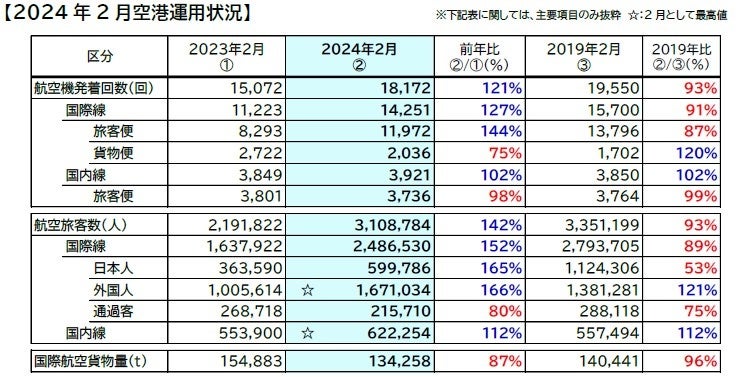 ●国際線旅客数は、248万人(2019年同月比89%)で、そのうち外国人旅客数は167万人(2019年同月比121%)となり、2月として最高値を更新、過去3番目の水準となりました。日本人旅客数は59万人(2019年同月比53%)で、引き続きコロナ禍前の半分程度の水準で推移しています。