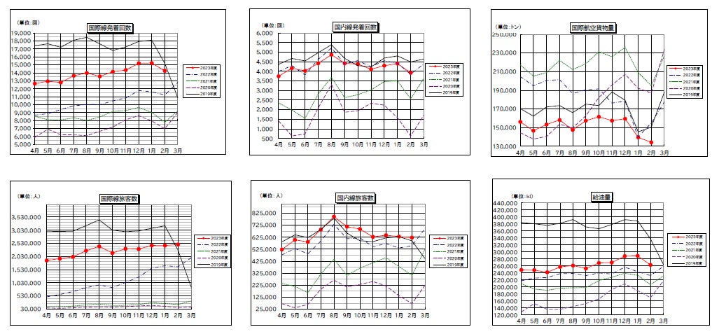 ●国内線については、発着回数は3,736回(2019年同月比99%)と引き続きコロナ禍前と同水準で推移していますが、旅客数では62.2万人(2019年同月比112%)となり、 2月として最高となりました。