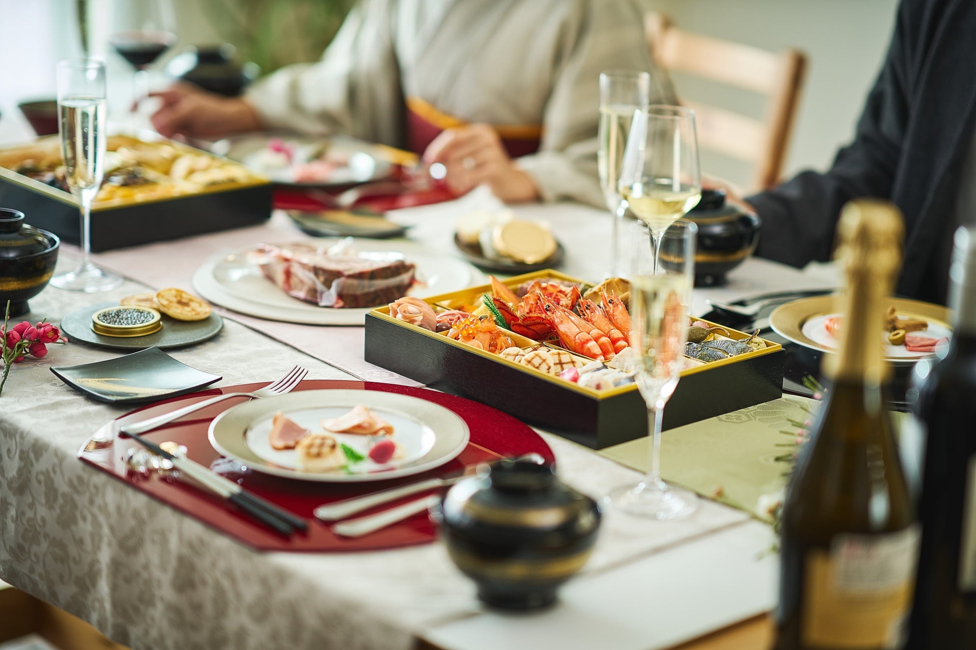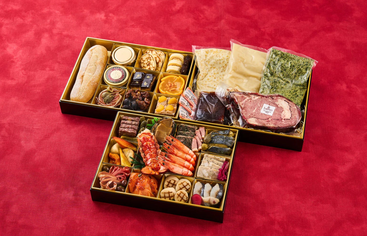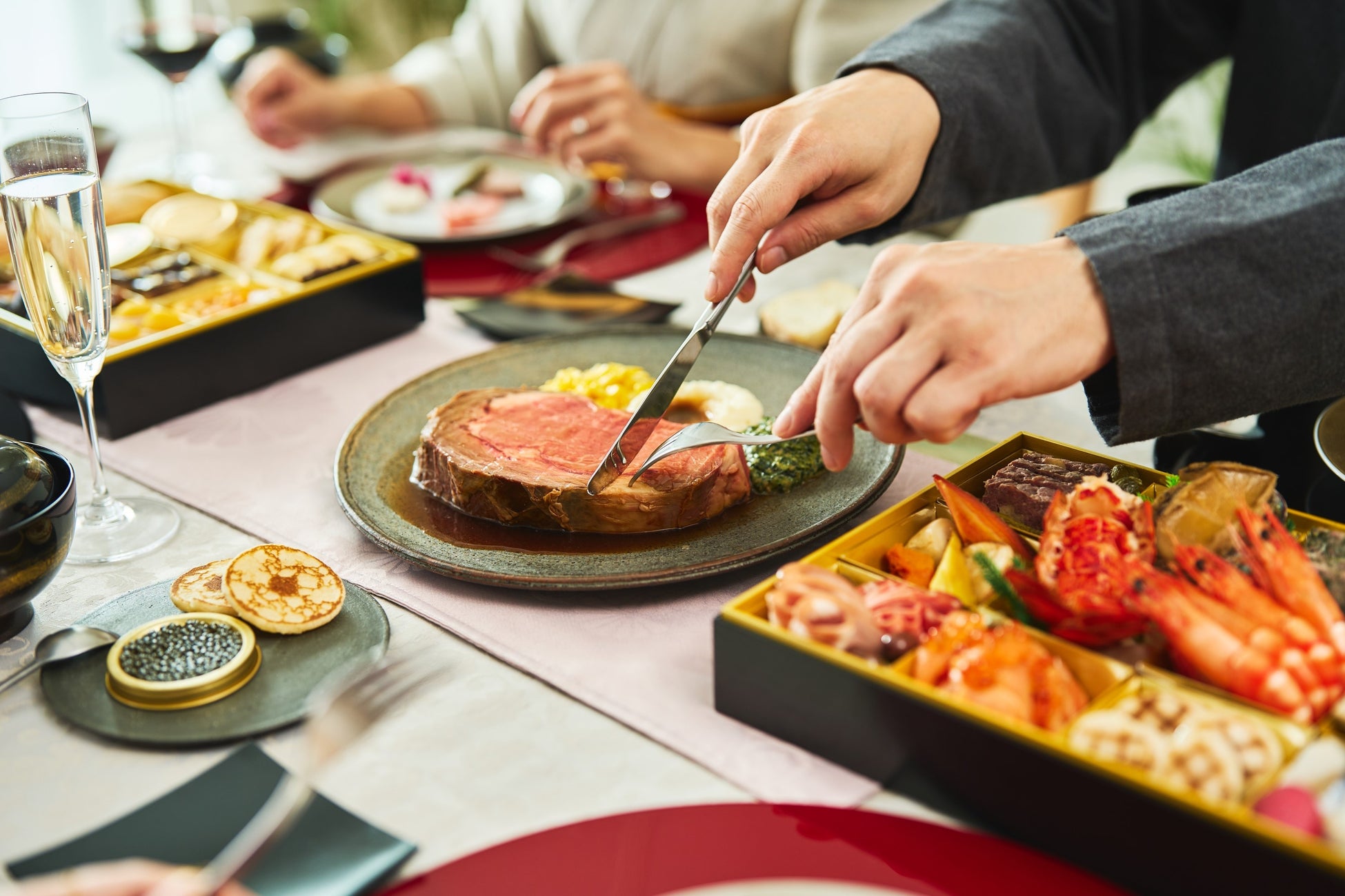 2025年のおせちは、この要素をちりばめ、自慢の“プライムリブ”だけでなく様々なコンテンツを詰め込んで、より選べる楽しさを充実させています。前菜からデザートに至るまで、まるでレストランディナーのような洋風おせちです。種類は、プライムリブとお食事を楽しめる二段重、キャビア・トリュフバターと厳選デザートが付いた三段重の2種類をご用意します。