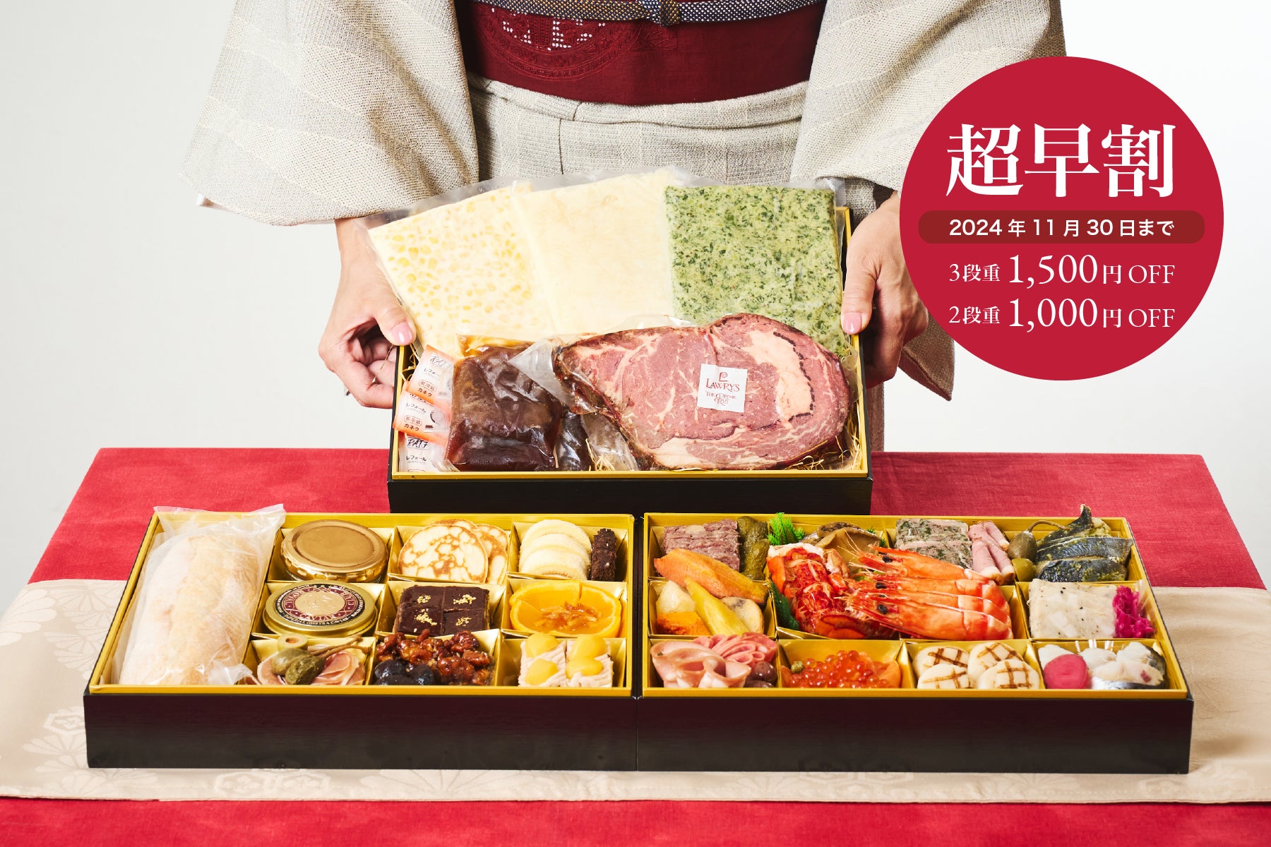 株式会社ワンダーテーブル[本社:東京都新宿区西新宿/代表取締役社長 河野 博明]では、アメリカンダイニング「ロウリーズ・ザ・プライムリブ(以下、ロウリーズ)」による、全国配送可能な通販おせち『Lawry's New Year OSECHI』を販売しています。早割特典として、2024年11月30日(土)までのご予約で、2段重は¥1,000オフ、3段重は ¥1,500オフといたします。