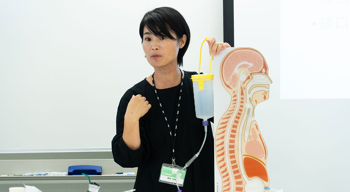初日は、「高齢者の食生活を支えるチームケア」に関する講義が行われ、日本の高齢者を取り巻く実態や専門職と他職種の連携について説明されました。その後、歯科衛生学科、作業療法学科、介護福祉学科の教員による講義と実習が続きました。