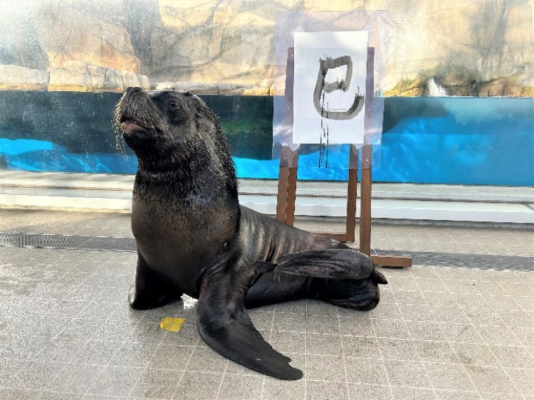 特製の筆を口にくわえ、飼育員と協力して、2025年の干支 「巳」の文字を書きます。力強い筆づかいで、しなやかな「巳」を表現します。