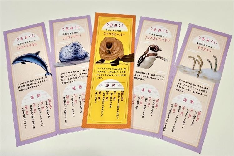 『仙台うみの杜水族館』にくらす生きものたちのかわいらしいイラストが描かれたオリジナルのおみくじ 「うおみくじ」を販売いたします。