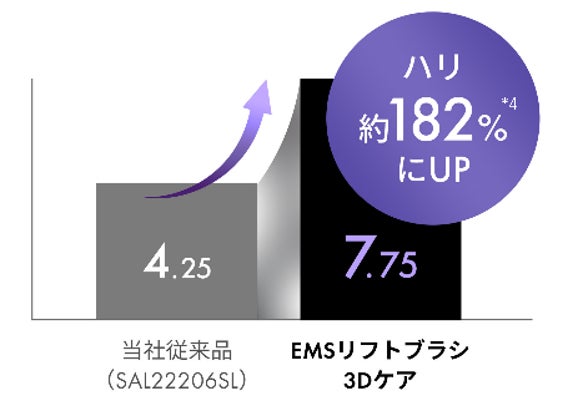 *4 自社測定。25~40歳男女6人で試験を実施。以下の条件で商品を使用後、弾性を測定。条件:片側測定 FACEモード レベル3で2分30秒使用。グラフは平均値。当社従来品EMSリフトブラシ(SAL22206SL)の比較。使用環境(温度・湿度など)や個人差で効果は異なります。