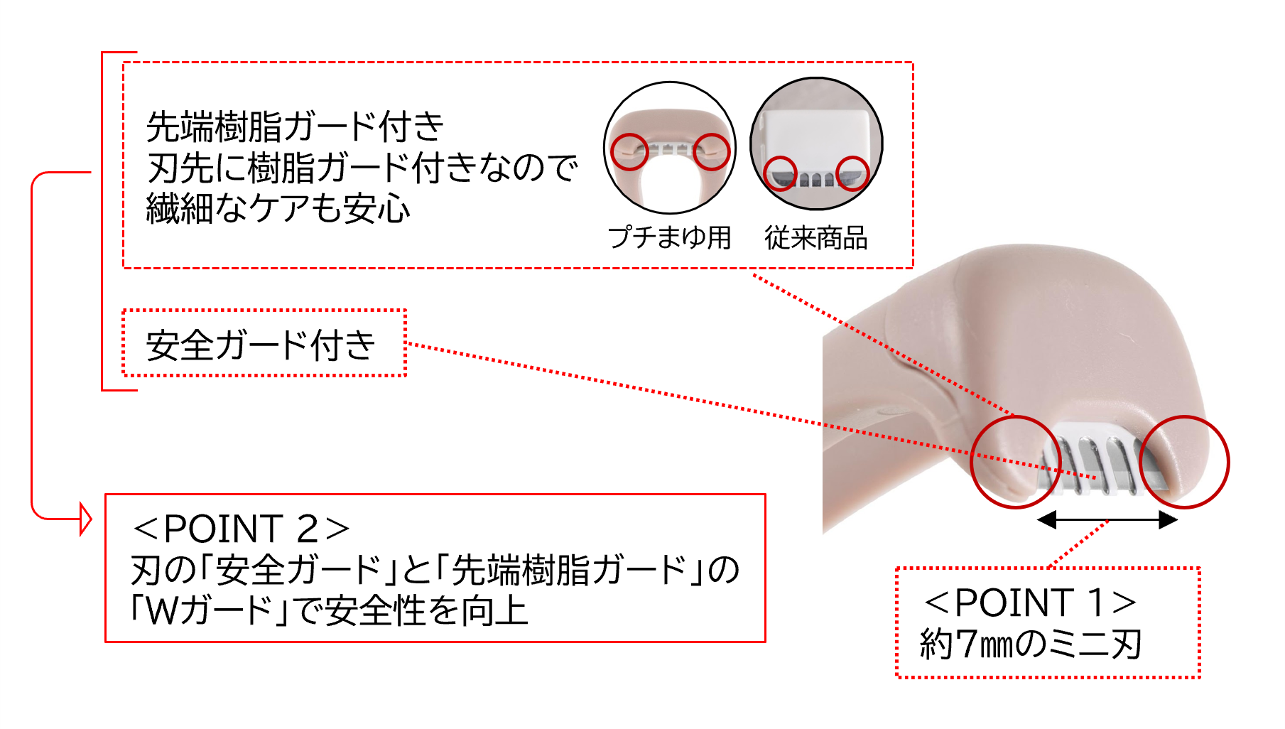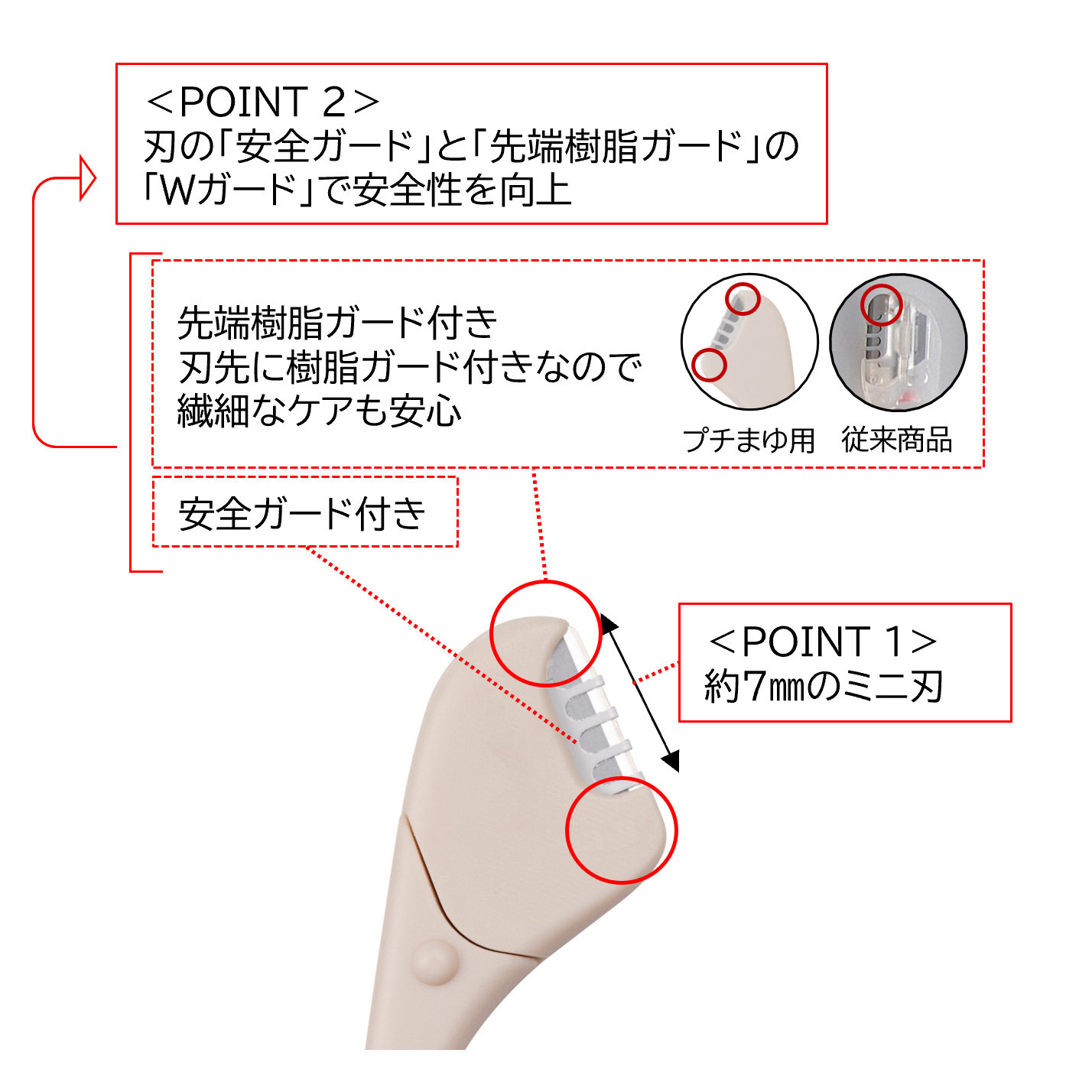 細かいケアのしやすさにこだわった「プチまゆ用カミソリ」は、約7㎜の超ミニ刃とそる部位を見やすい形状のカミソリ。刃は先端樹脂ガードと安全ガードのWガード仕様とすることで安全性を向上させているため、まゆの仕上げなど繊細な細部のケアも安心です。