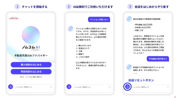 ① ノムコムAIアドバイザー(不動産情報サイトや外部情報を参照する対話型チャットサービス)