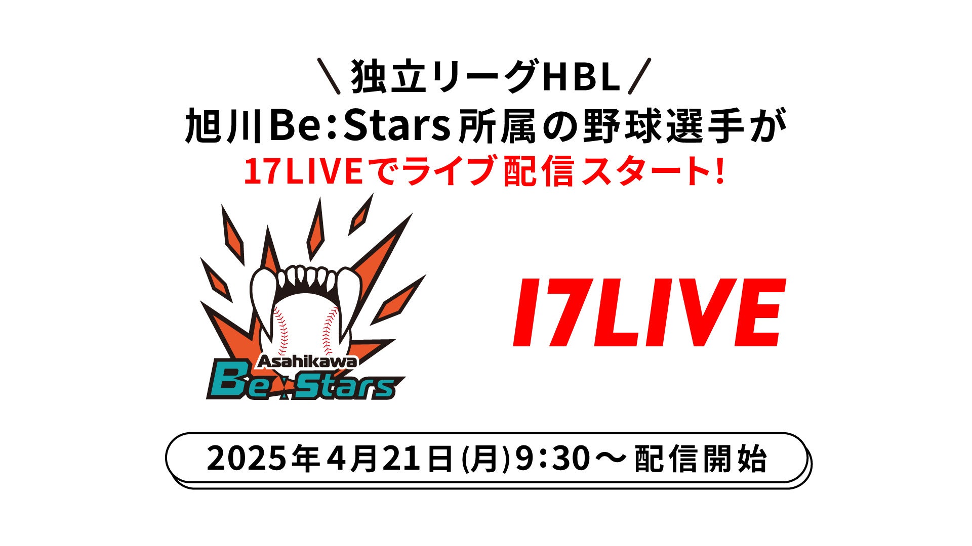 17LIVE株式会社(東京都渋谷区、代表取締役:ジャン・ホンフイ、URL:https://jp.17.live/)が運営する日本最大級のライブ配信アプリ「17LIVE(イチナナ)」は、北海道を活動地域とするプロ野球独立リーグに加盟の「旭川Be:Stars(ビースターズ)」に所属する選手が、ライバー(ライブ配信者)として、2025年4月21日(月)より順次「17LIVE」での配信を開始することが決定しましたので、お知らせいたします。